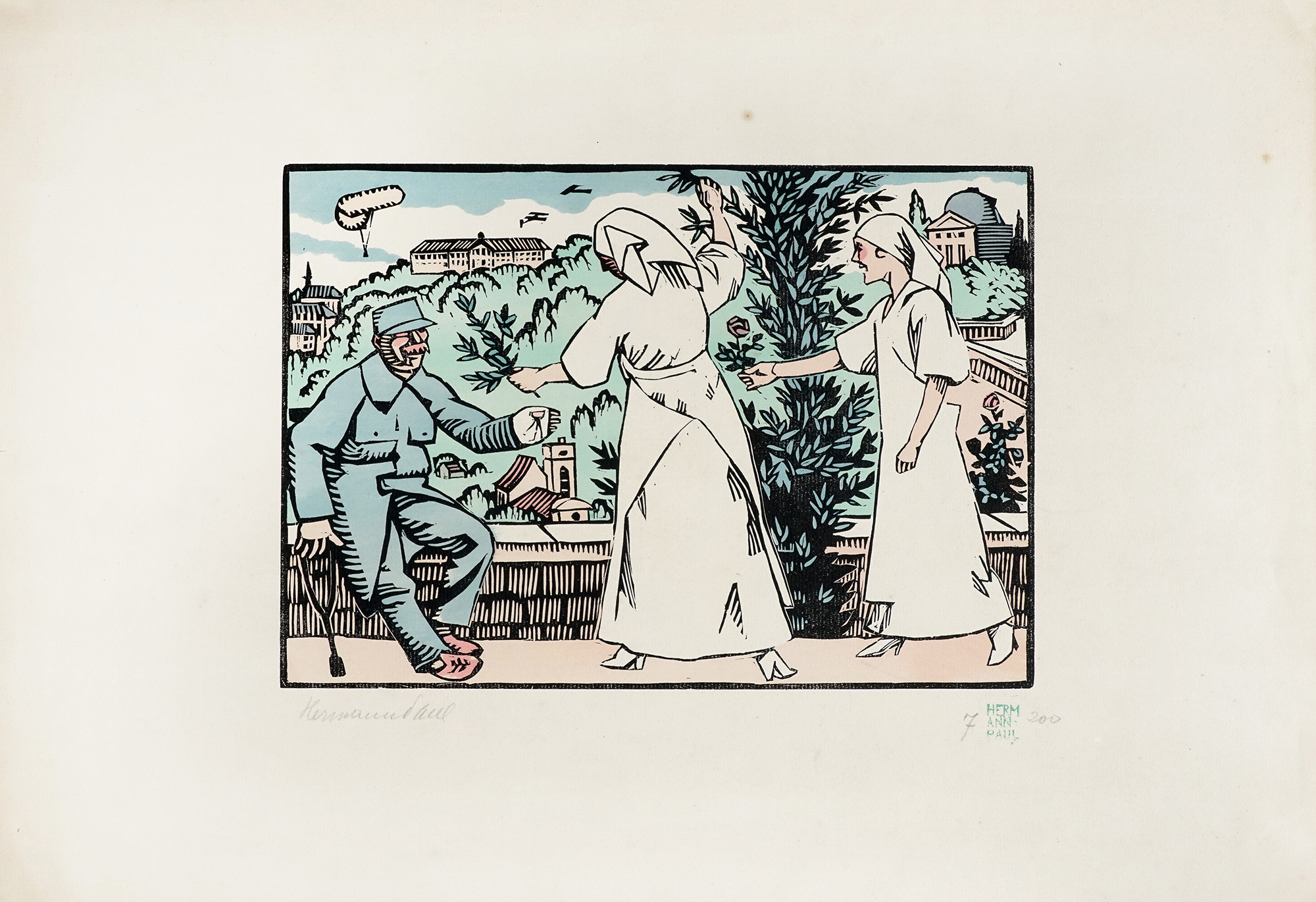 1) The grateful veteran.1915. Xilografia a colori su carta vergellata. mm 205x300. Foglio: mm 380x560. Firmata a matita in basso a sinistra. Timbro xilografico d'artista in basso a destra, con indicazione di tiratura a matita. Es. 7/200. 2) Soldati. 1915. Xilografia a colori su carta vergellata. mm 210x265. Foglio: mm 375x430. Firmata in lastra in basso a destra. Timbro xilografico d'artista in basso a destra con indicazione di tiratura e controfirma a matita sottostante. Es. 47/100. (2) Pieghe sparse lungo i margini. Strappetti su un foglio. Buona conservazione degli incisi.