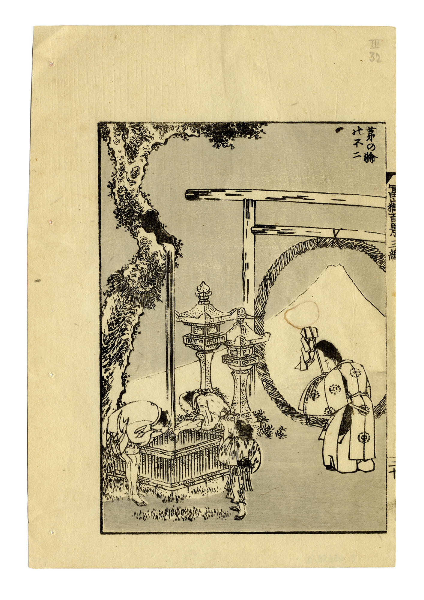 Xilografia in nero e grigio (sumizuri-e). Formato: hanshi-bon (mm 182x122, foglio: mm 242x164). Firma: Zen Hokusai Iitsu. Intagliatori: Egawa Tomekichi e Tsentaro. Tavola 17 dal I volume di Fugaku hyakkei (Le cento vedute del Fuji), opera costituita da 102 xilografie pubblicate in tre volumi nel 1834-35 (I e II volume) e negli anni '40 (III volume). / Id., Chinowa no Fuji . Xilografia in nero e grigio (sumizuri-e). Formato: hanshi-bon (mm 184x127, foglio: mm 242x164). Tavola 32 dal III volume di Fugaku hyakkei. (2) Due mezze pagine integre con traccia di forellini di legatura lungo uno dei lati.