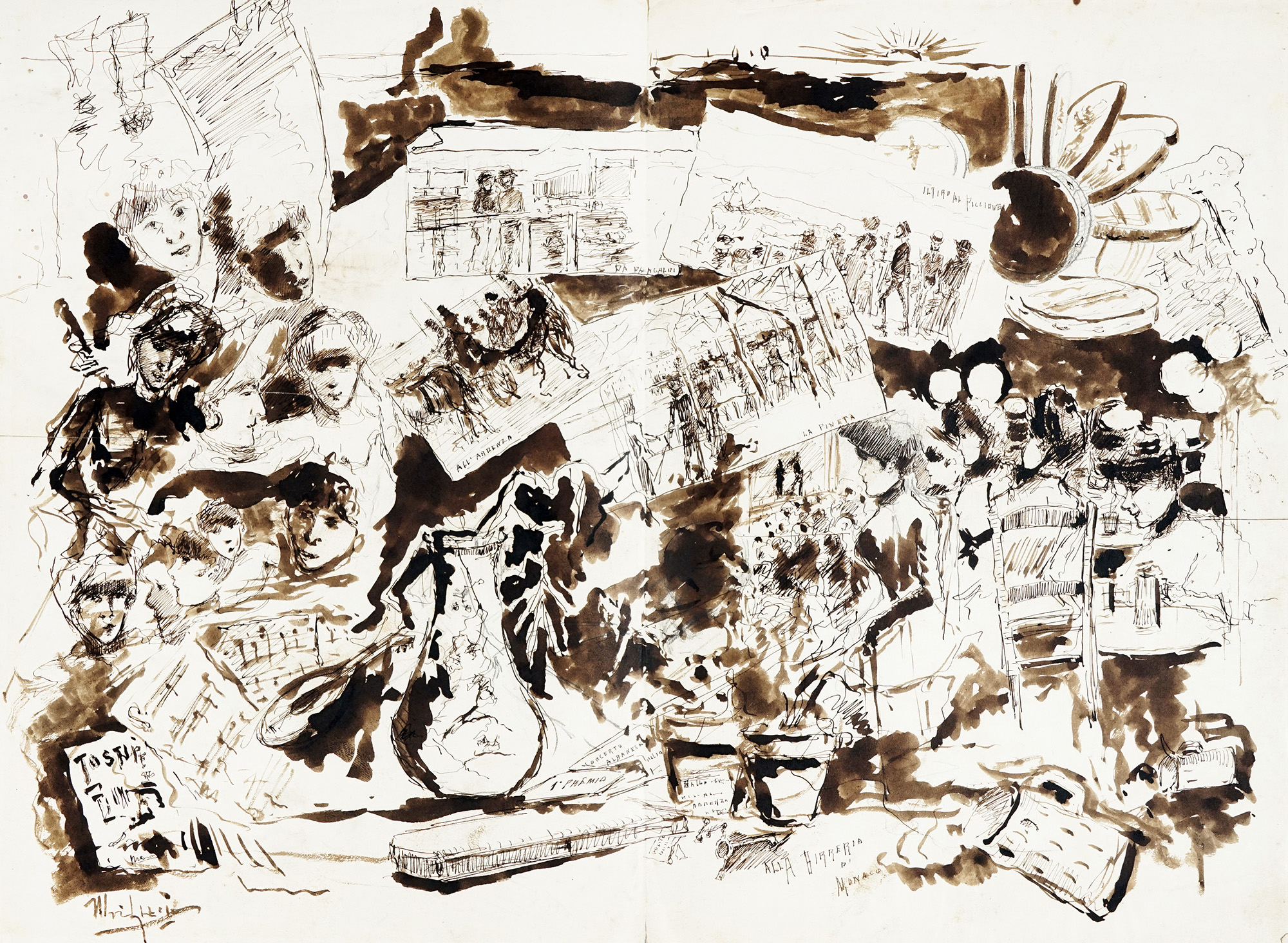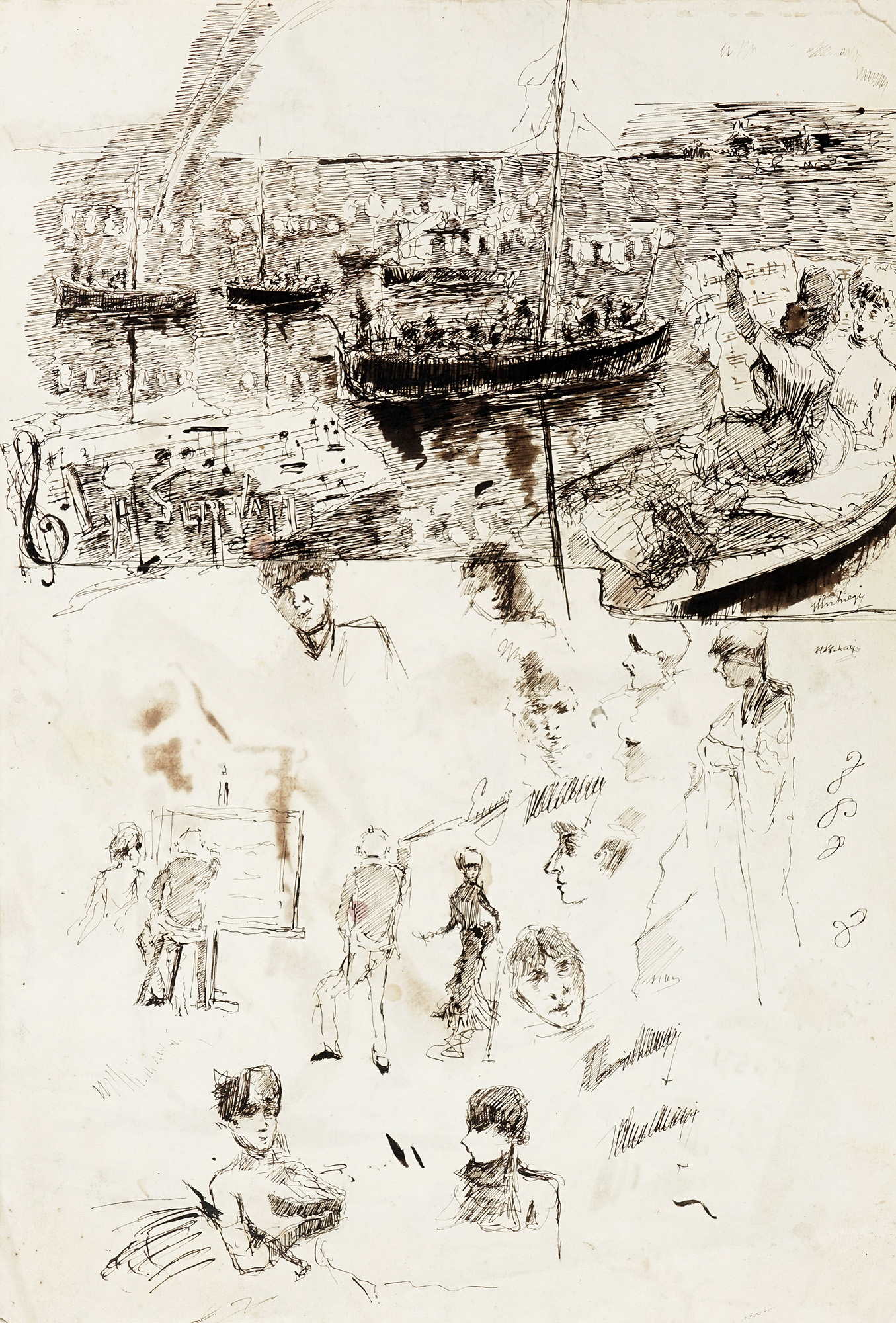 Penna e inchiostro di china bruno e bistro su carta. mm 325x220 (aperto). Firmato varie volte lungo i margini del foglio e dei disegni. Compongono la scena molteplici illustrazioni titolate. Al piatto anteriore, La Serenata, comprende figure canterine su imbarcazioni. Aprendo il foglio troviamo La birreria di Monaco, dove in una gioviale scena di convivialità compaiono quattro piccoli riquadri illustrati e titolati rispettivamente All'Ardenza, La pineta, Il tiro al piccione e Da Pancaldi. (1) Piccoli strappetti lungo i margini. Un taglio al margine sinistro. Buona conservazione generale.