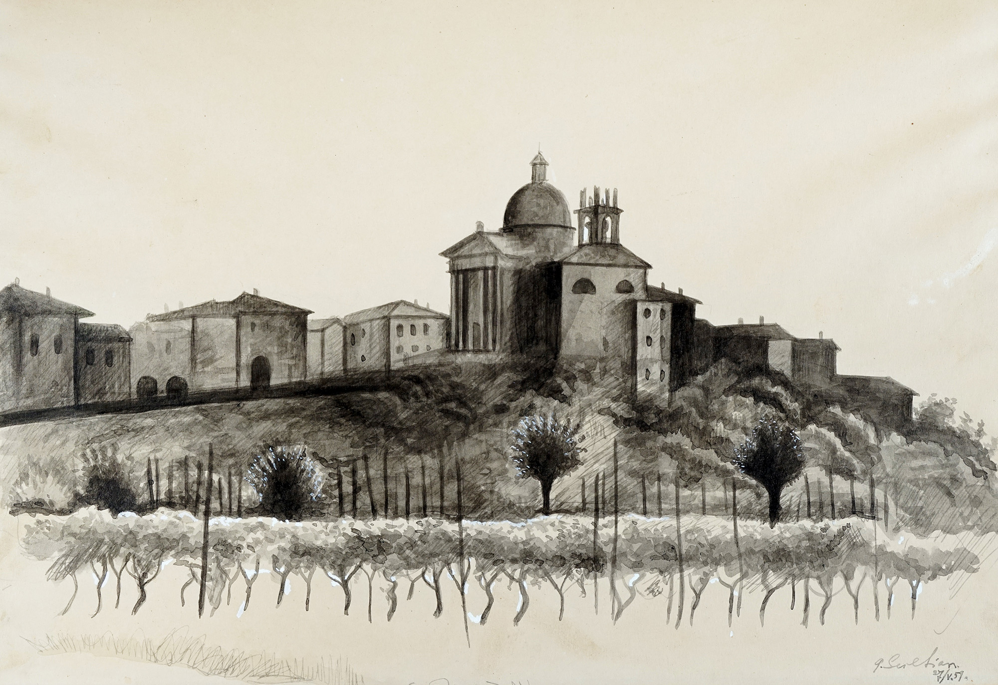 Matita e acquerello su carta. mm 320x445. Firma e "27/v59." a penna e inchiostro di china bruno in basso a destra. (1) opera applicata a passe-partout di supporto. Buona conservazione.