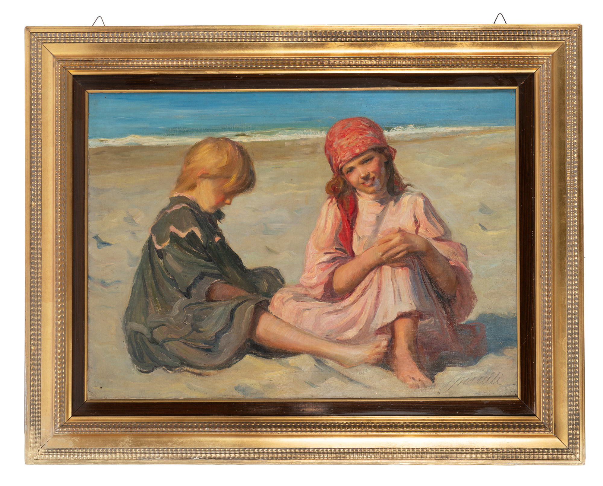 Gaetano Spinelli, Bimbe sulla spiaggia. Olio su tela. cm 61,5x86. Firma a...