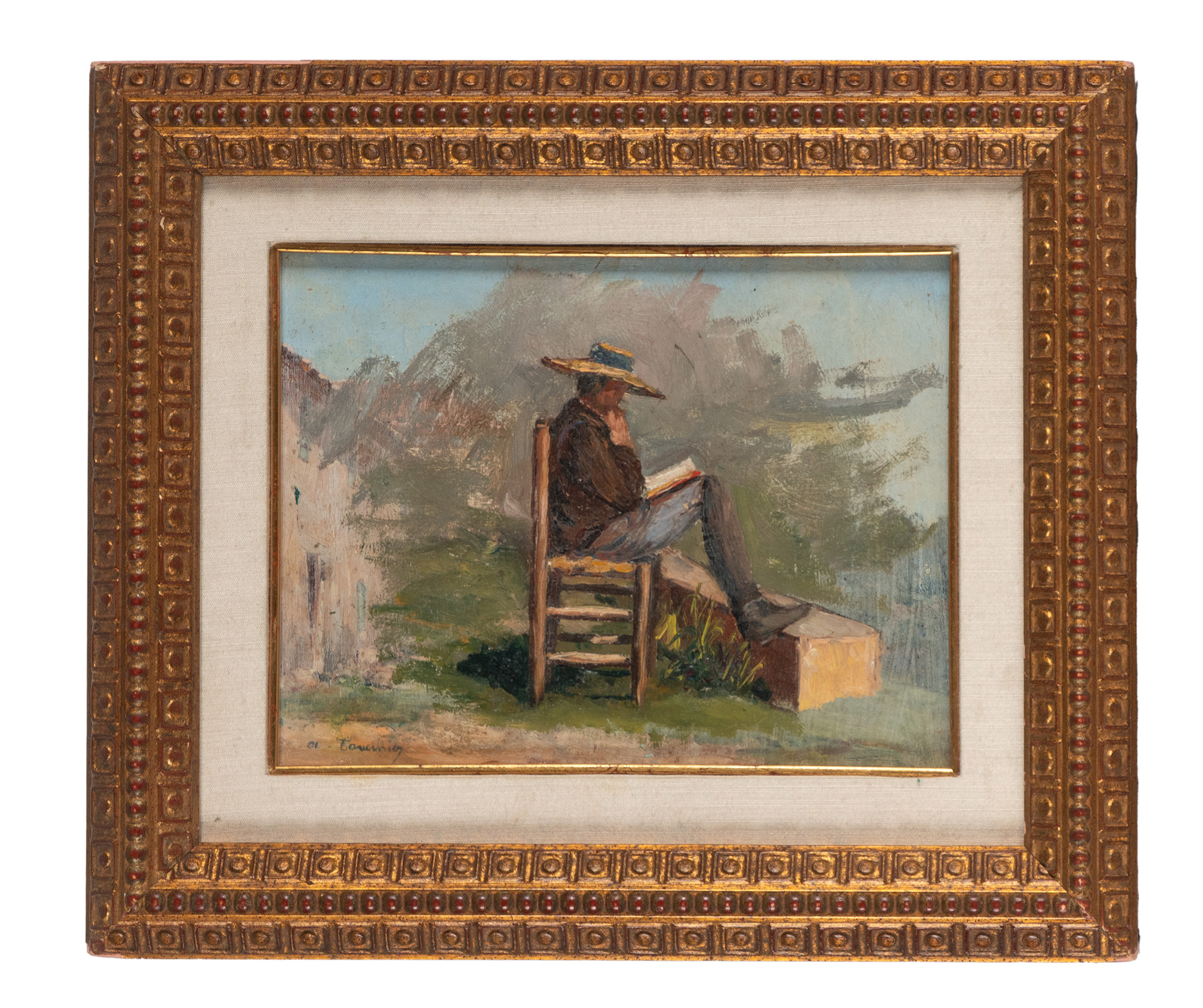 Andrea Tavernier, Uomo con cappello di paglia che legge. Olio su cartone. cm...