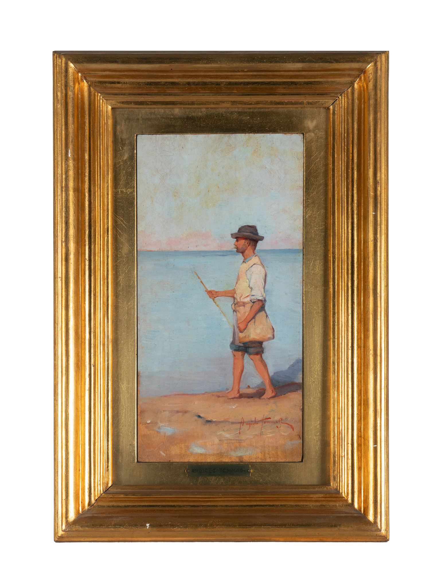 Angiolo Tommasi, Pescatore. Olio su tavola. cm 33x14. Firma in basso a...