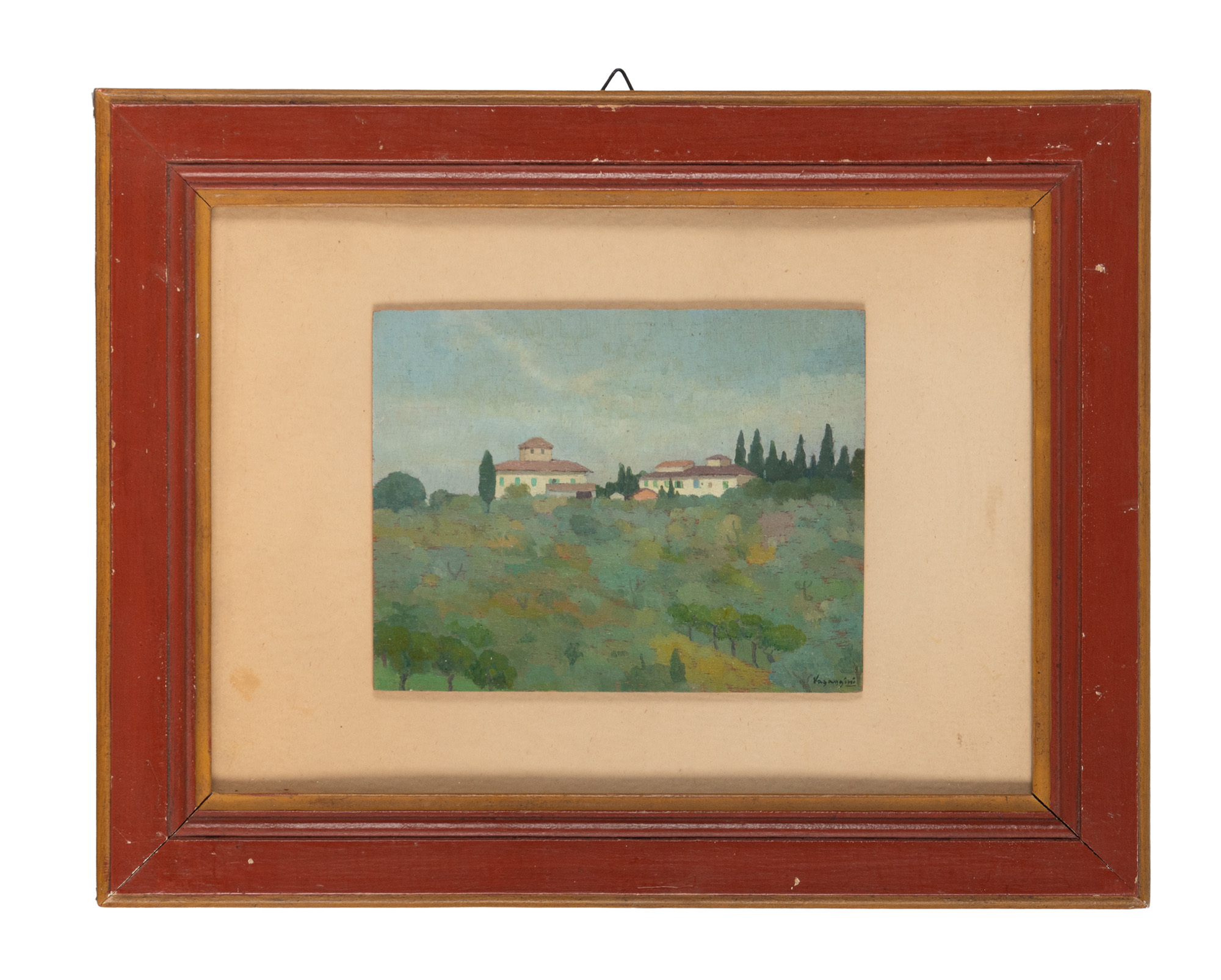 Vicodemo (detto Memo) Vagaggini, Paesaggio con case. Olio su tavoletta. cm...