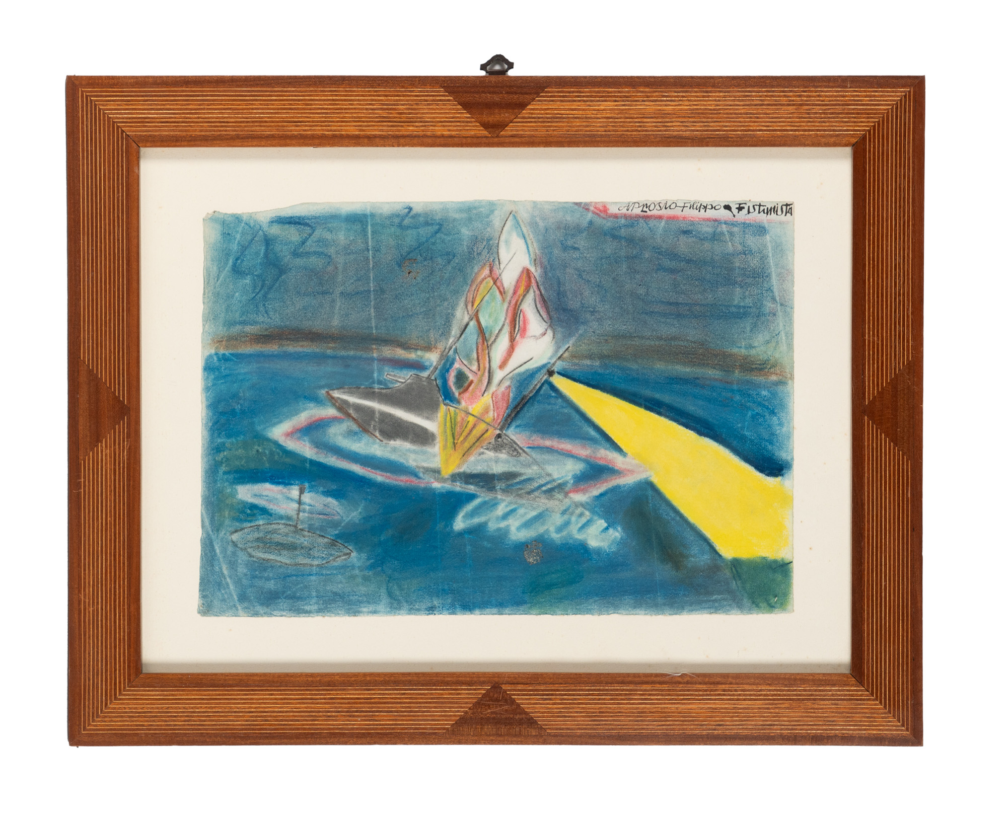 Pastelli colorati, carboncino e colore argentato su carta. mm 240x345. Firma in alto a destra. Al verso targhette varie delle provenienze e dati dell'opera. Provenienza: Collezione Carpi; Arte Centro, Milano; Collezione Corona. (1) In cornice: cm 39x49,5. Ottima conservazione, tranne alcune pieghe del foglio.