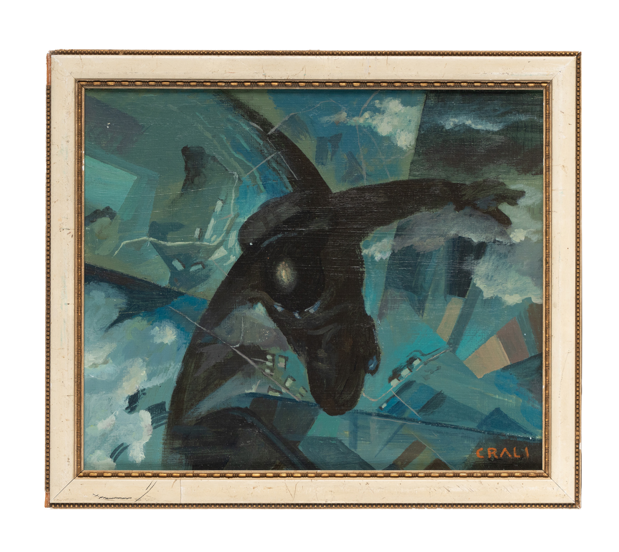 Olio su tavoletta. cm 23,7x28,8. Firma in basso a destra. Controfirma a china al verso e "Studio", con timbro de "Crali Torino". Provenienza: Collezione Raimondi; Collezione futurista romana. (1) In cornice con mancanze: cm 28x32. Poche e trascurabili cadute di colore, altrimenti ottima conservazione.