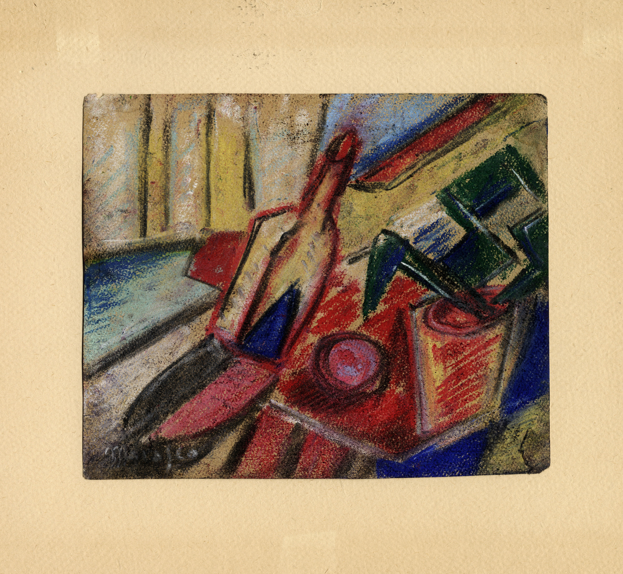 Antonio Marasco, Natura morta con bottiglia. Carboncini e pastelli grassi su...
