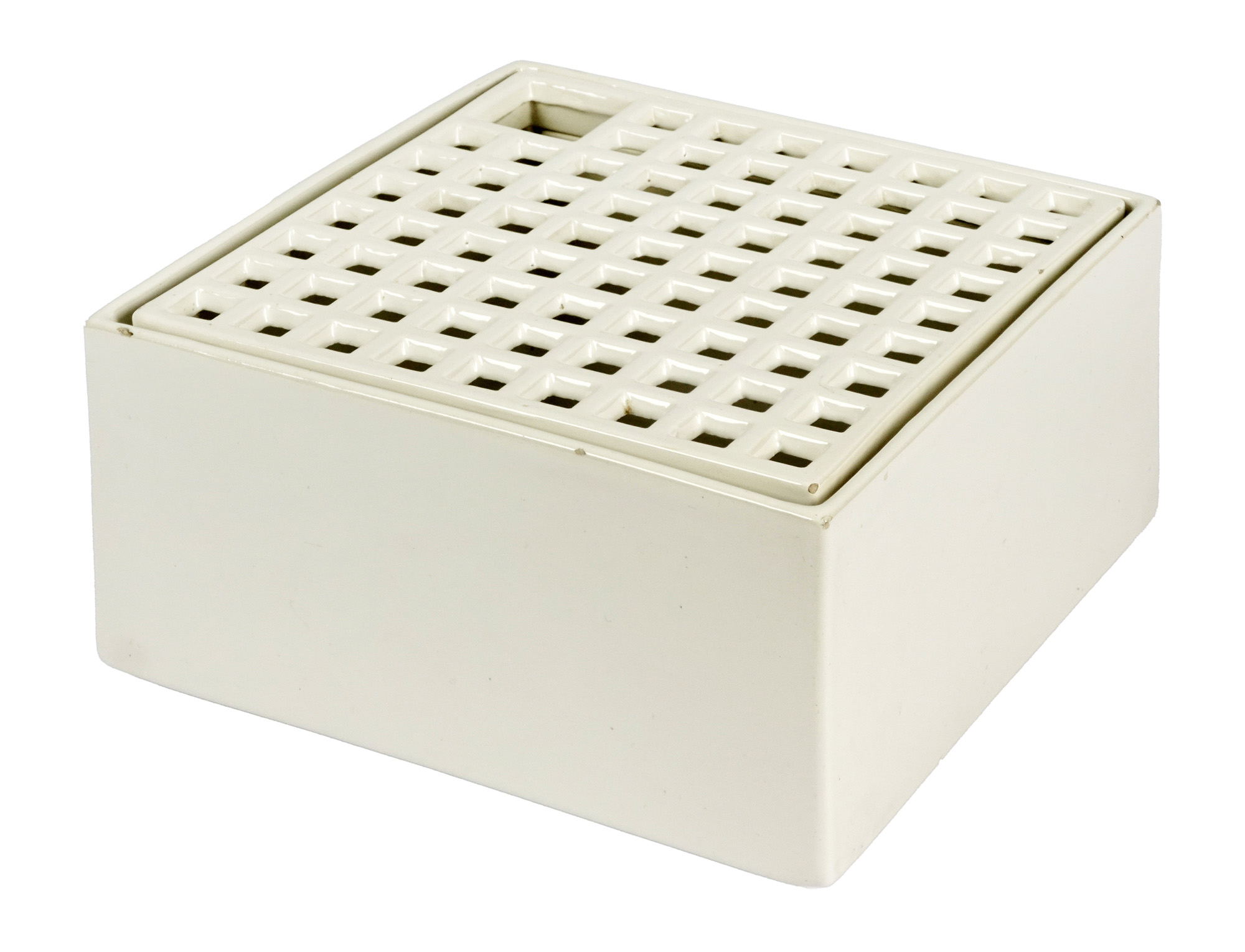 Ceramica smaltata bianca. cm 13x24,5x24,5. Manifattura Gabbianelli, la cui "G" è smaltata in rilievo sul fondo dell'oggetto. L'Ikebana è l'arte giapponese del disporre i fiori recisi, la traduzione letterale è "fiori viventi" o "portare i fiori in vita". Vaso composto da un corpo cubico con griglia removibile forata. Gli spazi creati fungono da alloggio per i vari steli. (1) Piccole sbeccature lungo il perimetro della bocca e la base. Buona conservazione generale.