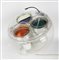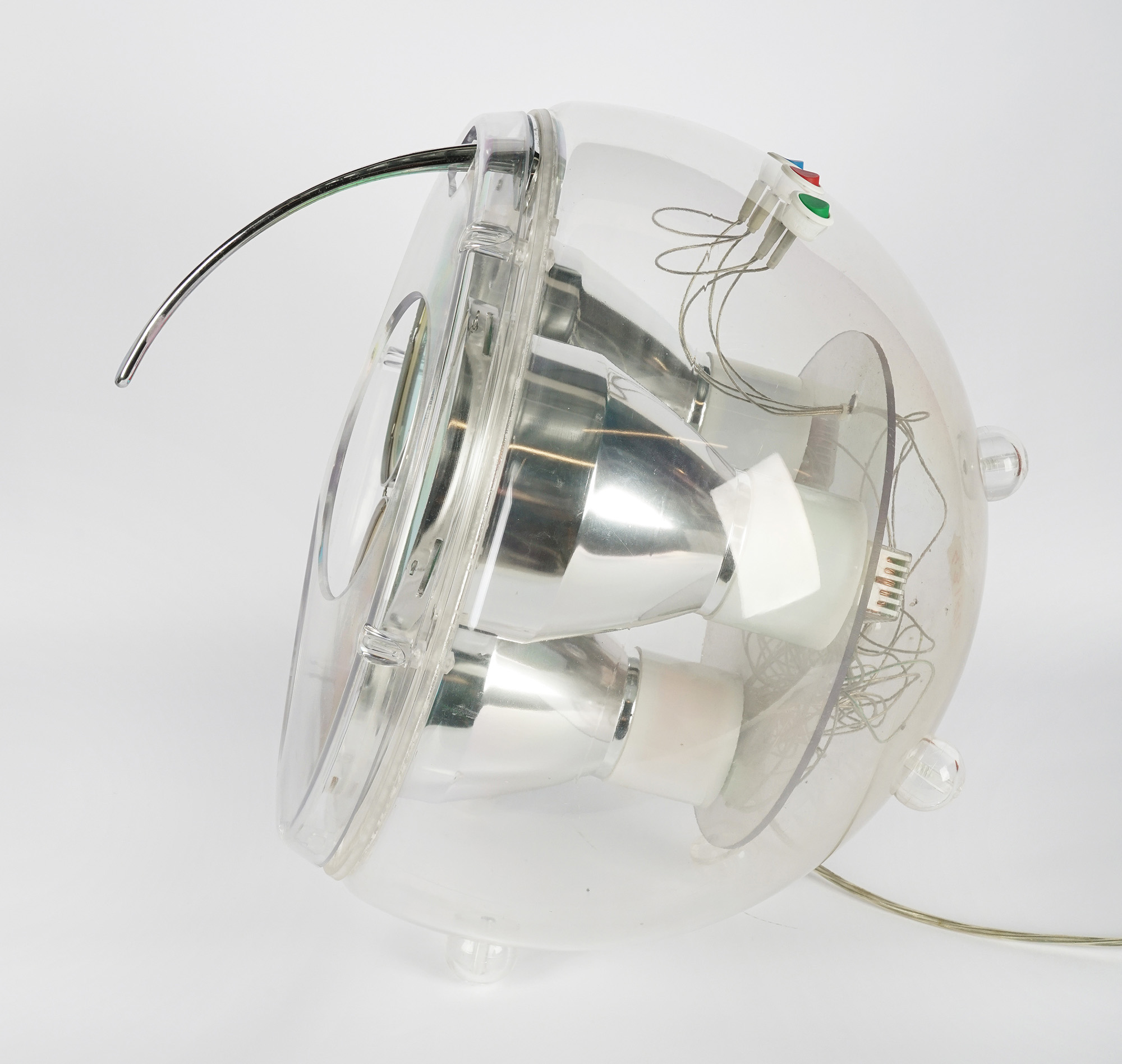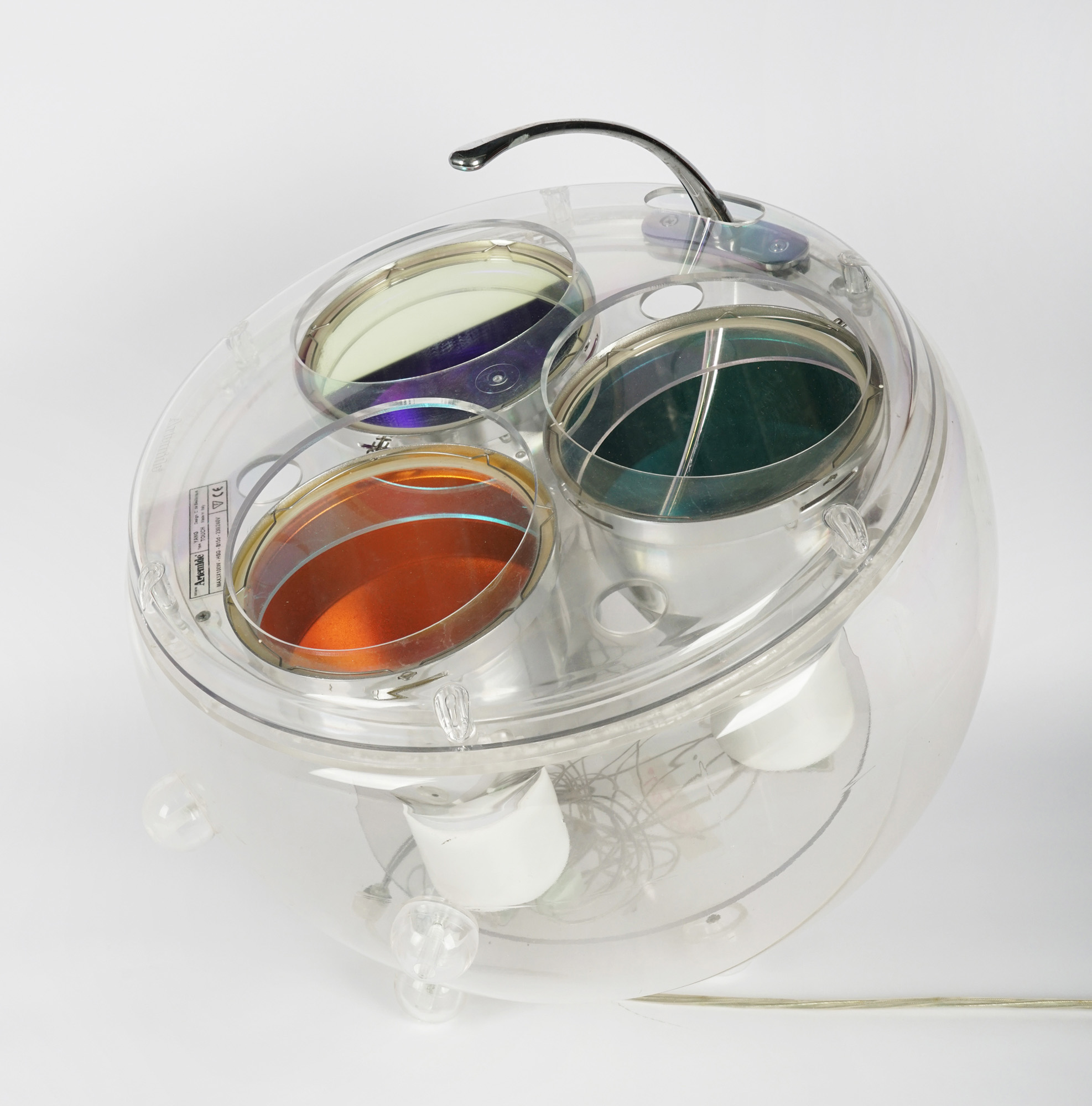 Struttura in metacrilato (PMMA) e policarbonato (PC) contenente tre lampade modulabili LED RGB 42W e maniglia in alluminio cromato. cm 31x40x40. Etichetta adesiva di Artemide recante le specifiche tecniche e il nome della designer Carlotta De Bevilacqua applicata alla scocca. "Artemide" impresso sullo stampo frontale. Tre pulsanti distinti per colore RGB (red, green e blu) permettono di interagire con le tre lampade corrispondenti: si apre così la possibilità di unire e "miscelare" i colori a seconda dell'occasione. Tenendo premuti i tasti, tramite un dimmer, viene regolata l'intensità luminosa. Sei piccoli piedini consentono tre posizioni differenti lasciando esposta la cablatura sottostante. Funzionante e completa del proprio cavo originale. (1) Trascurabili graffietti sul corpo. Ottima conservazione complessiva.