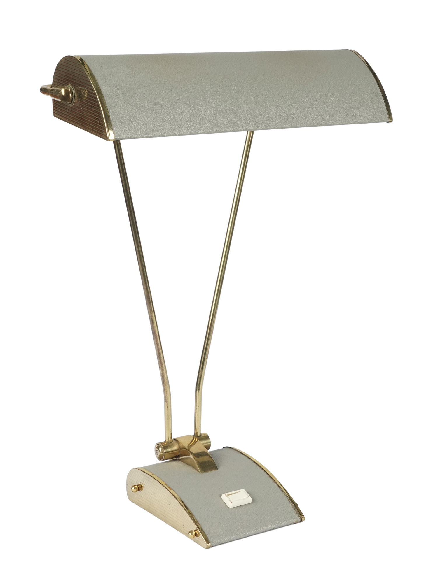Eileen Gray, Lampada da tavolo Jumo. 1960 ca. Metallo grigio e simil ottone....
