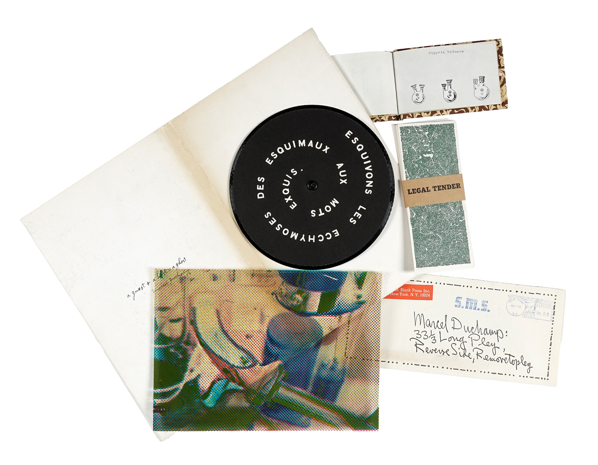 Portfolio di 11 multipli a tecnica mista e di misure varie. Il movimento Dada e il movimento Fluxus non erano d'accordo con l'autorità dei musei di determinare il valore dell'arte, né credevano fosse necessario essere istruiti per vedere e comprendere un'opera d'arte. SMS, ovvero "Shit Must Stop", ha aggirato le istituzioni tradizionali per distribuire le opere degli artisti direttamente al loro pubblico. Nel portfolio sono contenuti: 1) Duchamp M., Contrepèterie (copertina), 1968. diam. 17,5, disco in vinile. 2) Pfriem B., Una proposta di sezione comica di New York Times, 1968. mm 607x803 (e naturalmente ripiegato). Fotolitografia. 3) Johnson R., Una bambina di due anni è morta soffocata oggi su un uovo di Pasqua, 1967. mm 273x168. Fotolitografia. 4) Jacquet A., Tre separazioni di colore, 1968. Fotolitografia. mm 240x170. 5) Calas N., Cynocephalus & Co, 1968. Serigrafia e collage. mm 266x166. 6) Oppenheim M., Lo specchio di Jenoveva. 1968. Fotolitografia. mm 253x172. 7) Lozano L., Tesi. 1968. Libretto rilegato stampato. mm 75x12x7. 8) Conner B., Legal Tender, 1968. 30 fotolitografie. mm 146x67 cad. 9) Trouille C., Album. 1968. Libro stampato a colori con copertina in feltro rosso. mm 280x165. 10) Herscovitz M., 10 collage. 1968. 10 fotolitografie. mm 153x108. 11) Reavey G., Farwell to Faust. 1968. Serigrafia. mm 367x138. (1)