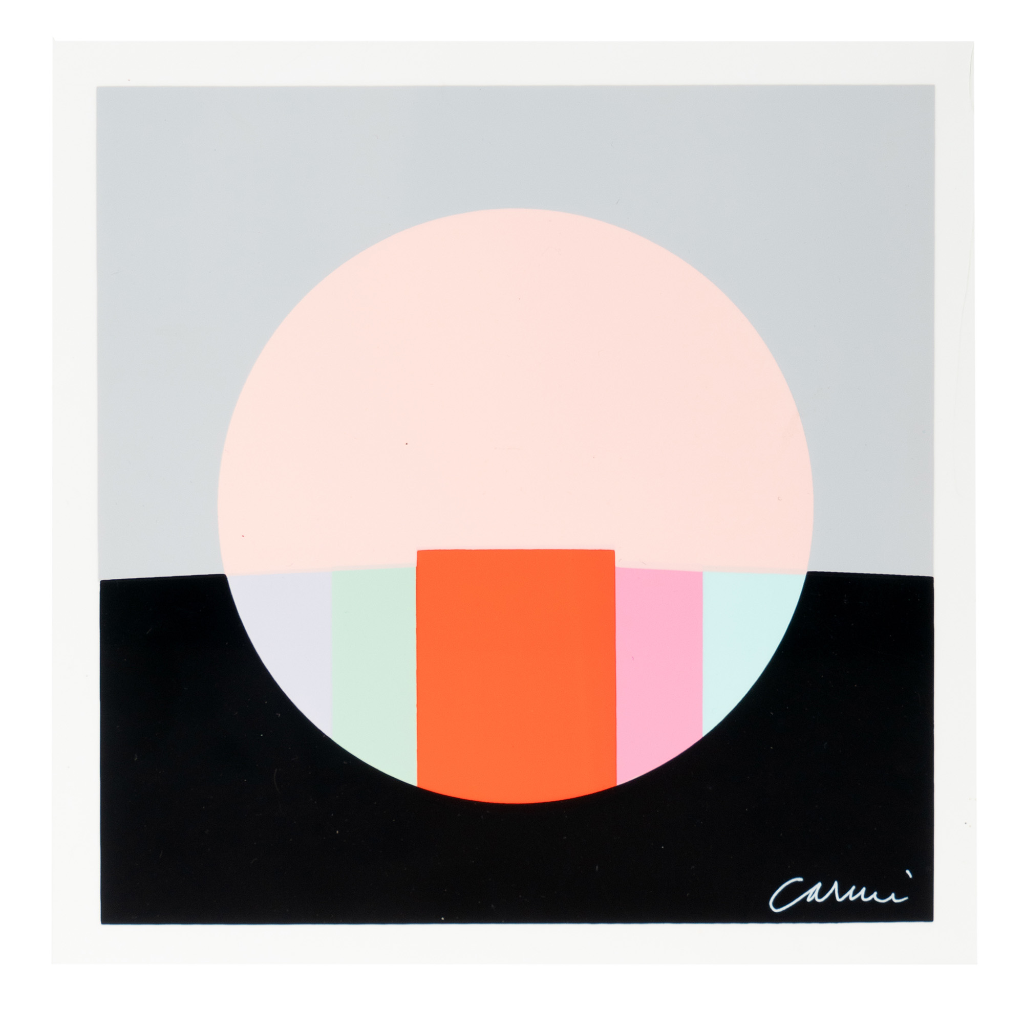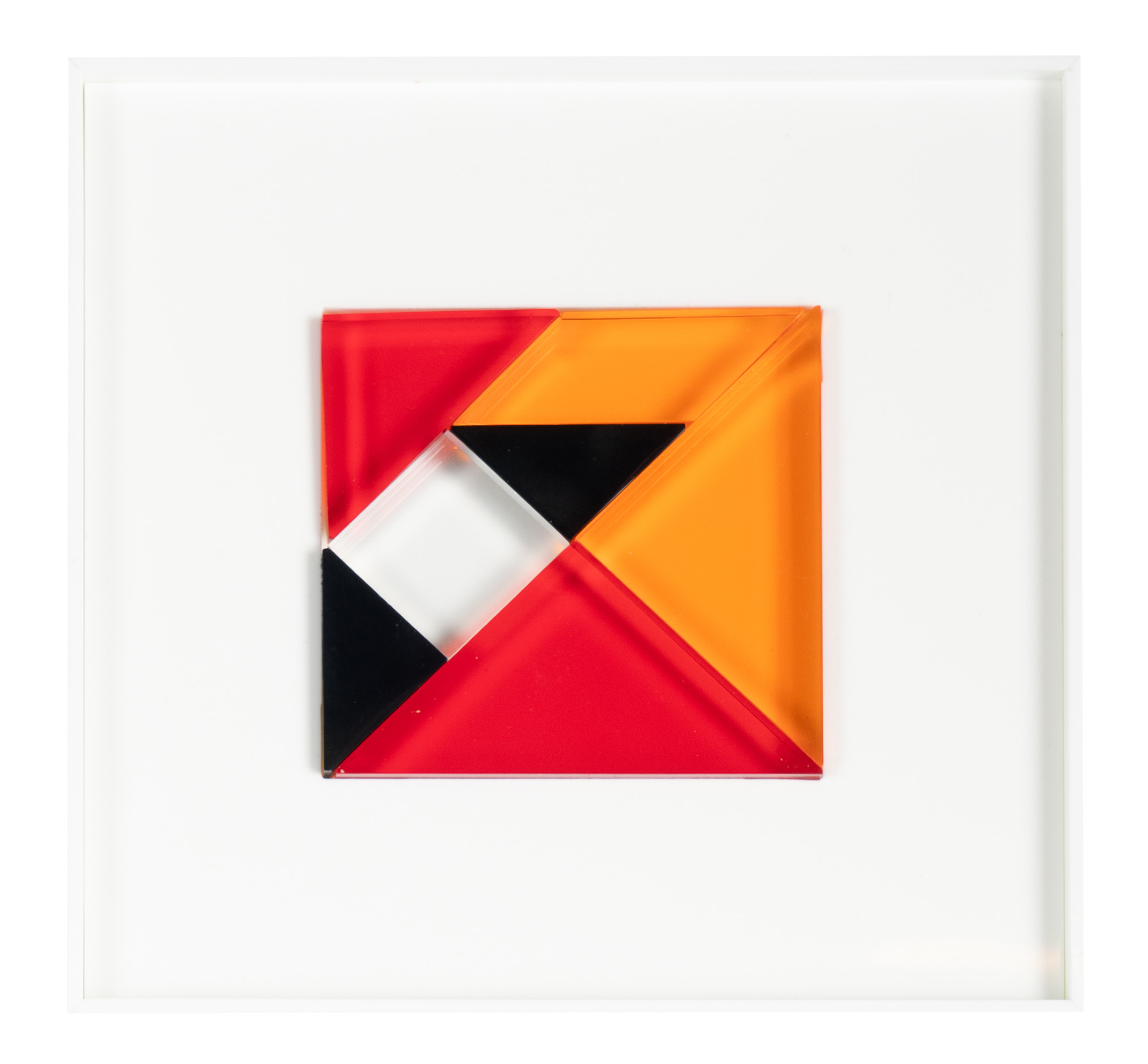 Scatola di plastica con stampata un'incisione dell'artista e contenente e i pezzi del Tangram a loro volta in plastica. cm 19,5x19,5. Gioco d'artista edito da SpiraleArte, Milano. (1) La scatola presenta una rottura in alto a destra.