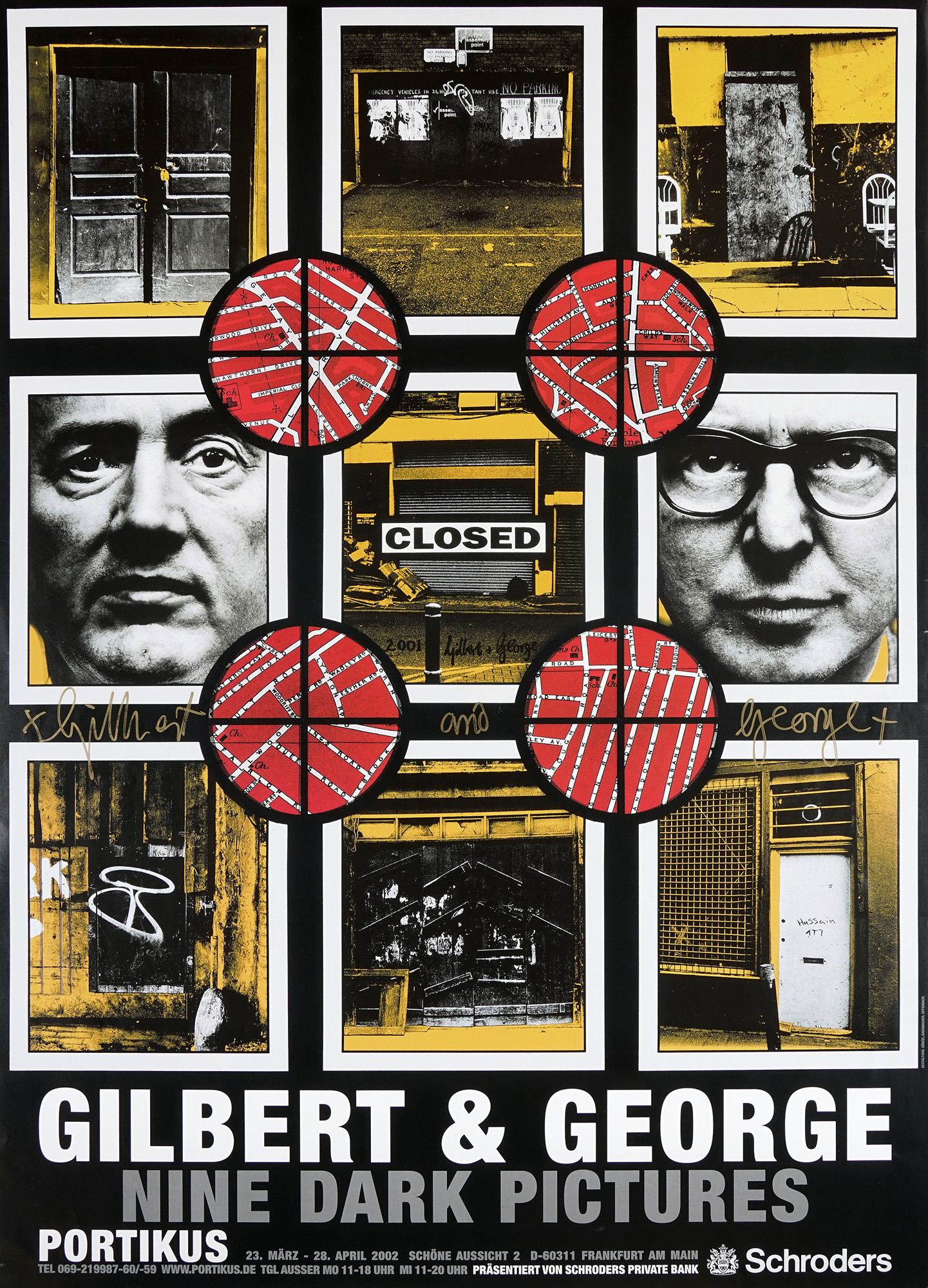 Gilbert&George [pseud. per Gilbert Prousch e George Passmore], Gilbert&George, Nine dark pictures. Manifesto della mostra con firma autografa. 2002.