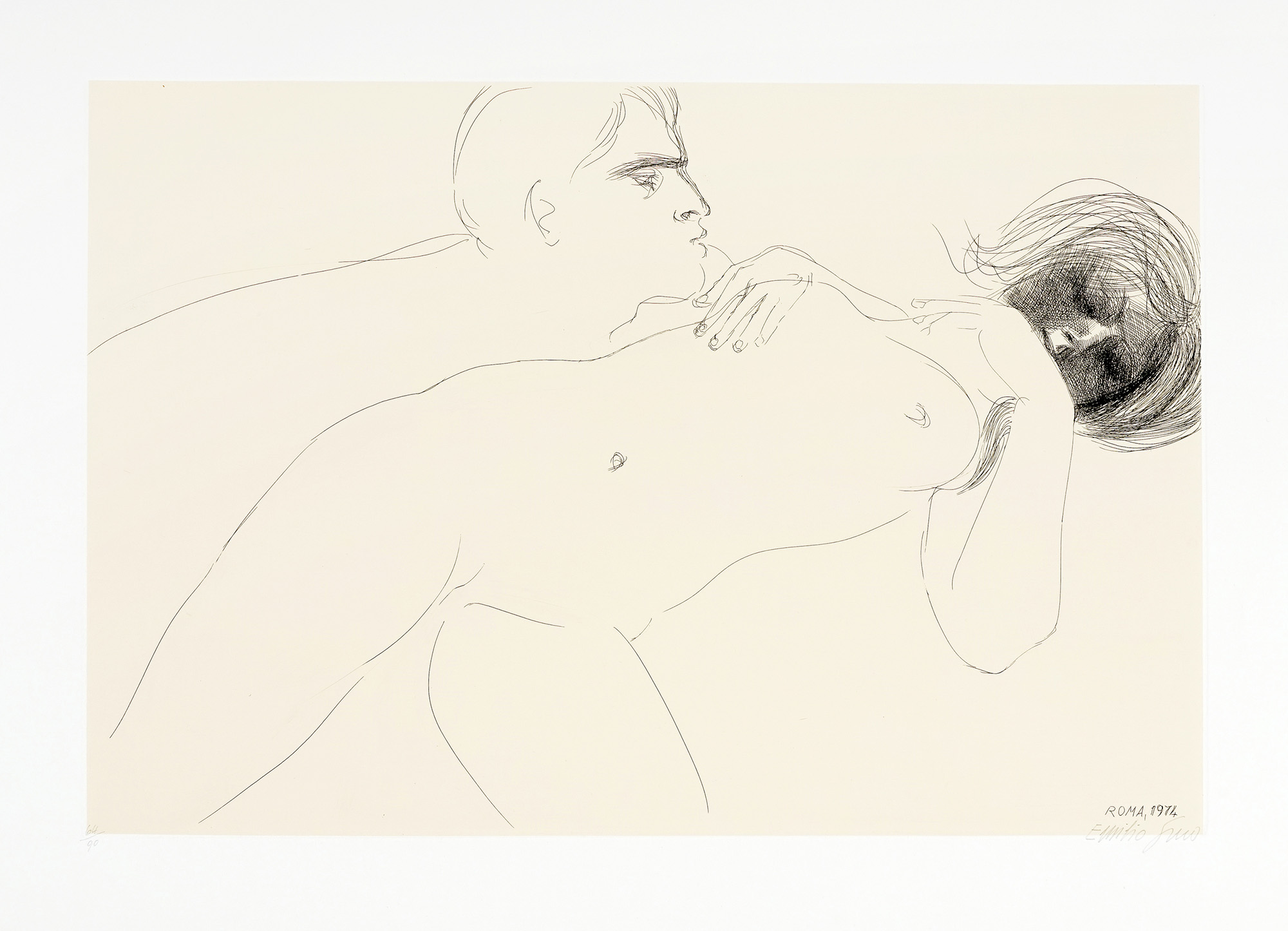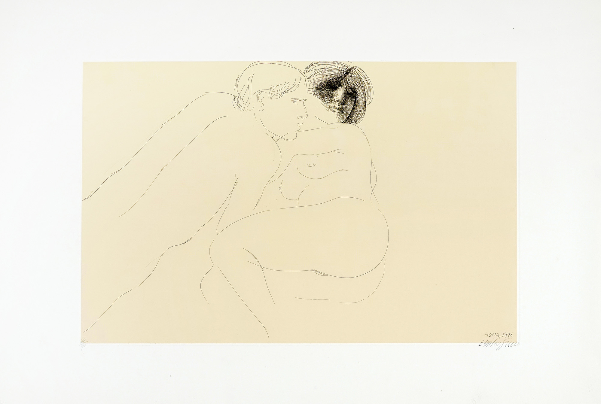Cartella editoriale mm 765x545 in piena tela marrone. Pagine [2] con 3 meravigliose tavole sciolte. Esemplare 64/90 con dedica a Lucia Cassano e firma autografa dell'artista. Le lastre in rame sono state incise nel 1974 dall'artista. mm 490x330. Foglio: mm 700x500. Ogni acquaforte è datata e riporta il luogo di incisione "Roma" in lastra, firmata a matita in basso a destra, numerata in basso a sinistra e contenuta in custodia protettiva in cartoncino con velina sciolta. Le incisioni sono su carta bianca rosaspina e ognuna è realizzata per accompagnare e rendere figurativamente tre splendide liriche dell'artista, stampate sulle custodie protettive di ciascuna. L'armonia erotica del corpo femminile è una tematica cara all'artista, il quale eleva la donna a protagonista delle 3 incisioni; sceglie, infatti, di dettagliare minuziosamente il volto di lei per coglierne le espressioni e le emozioni, e di lasciare che il viso maschile e i corpi di entrambi siano resi quasi totalmente da un unico tratto. (1) Un leggero foxing interessa la prima pagina, altrimenti conservazione ottima. Le incisioni vantano un'impressione perfetta.