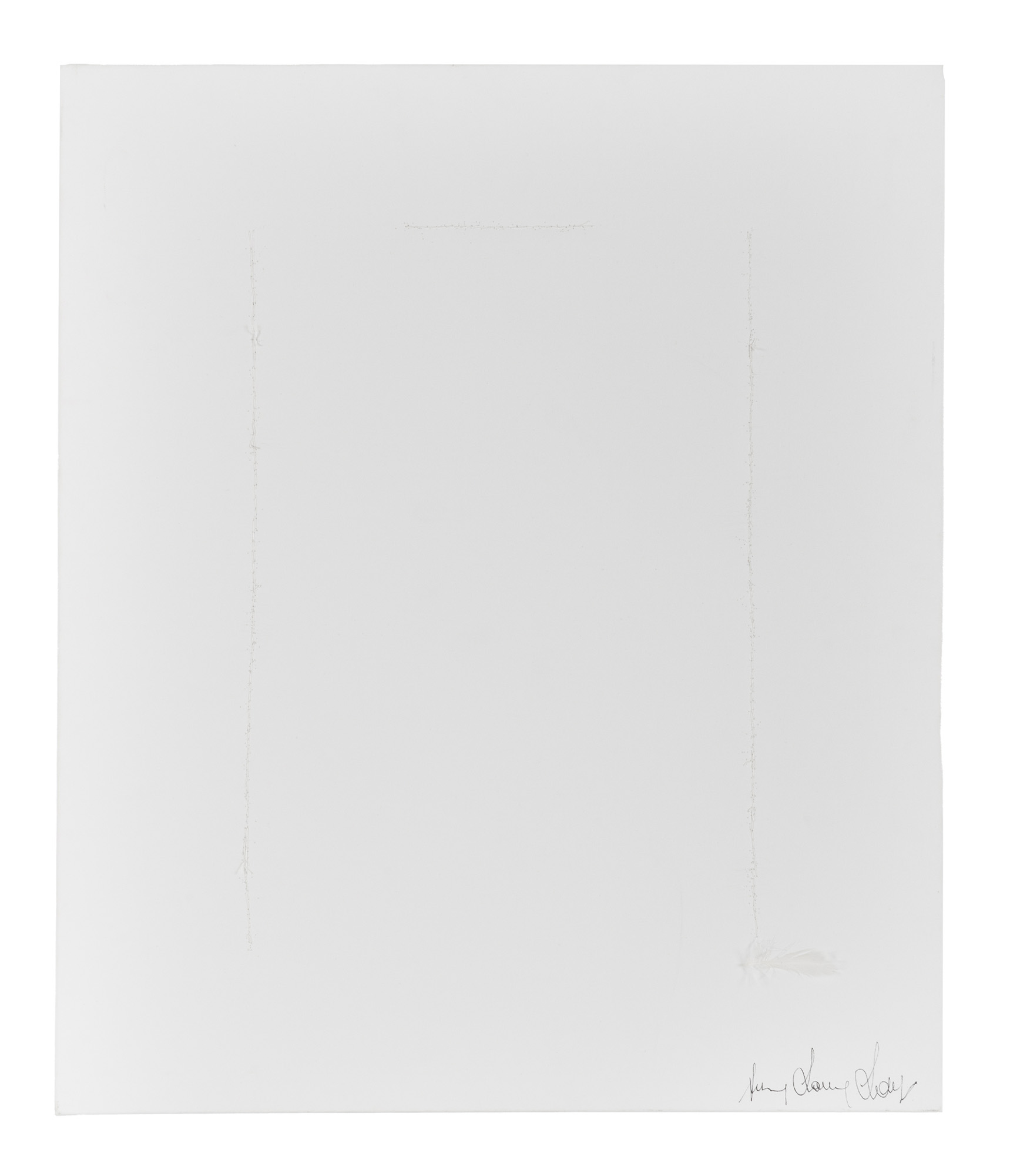 Collage di materiali su tela. cm 60x50. Firma al verso in basso a destra, con aggiunta di una piuma come inserto poetico. Opera accompagnata da certificato di autenticità. L'opera appartiene a un corpus di lavori avviati nel biennio 2019-2020 dove viene esaltata la magnificenza e l'eleganza del bianco. Si tratta di opere "Ton sur Ton" nelle quali viene portato alla ribalta il confronto tra il vedere distintamente e l'intravedere e dove, attraverso una libera esplorazione, si delinea una riflessione, restituita in termini propriamente visivi, sulla preziosità del monocromo. La ricerca verte in modo prioritario sui materiali. (1) Ottima conservazione.