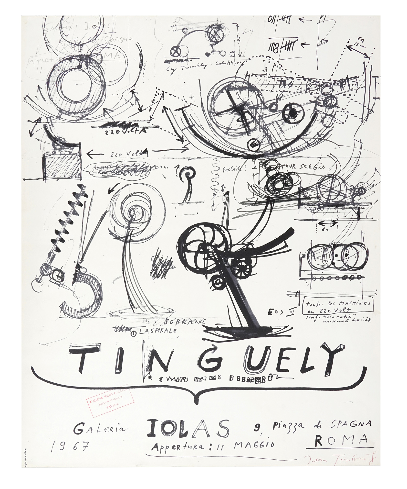 Manifesto per la mostra dell'artista presso la Galleria Iolas di Roma, sita in Piazza di Spagna al numero 9, nel 1967. Manifesto stampato da Sergio Tosi, Milano, con timbro a inchiostro rosso della Galleria in basso a sinistra e firma dell'artista a penna a sfera rossa in basso a destra. (1)