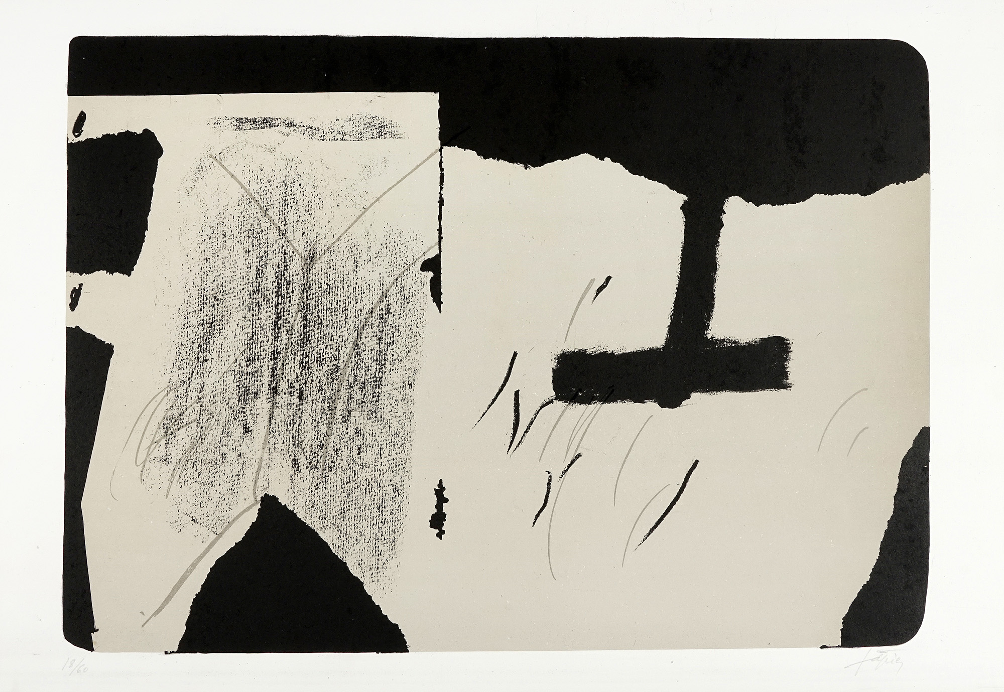 Litografia. mm 392x550. Foglio: mm 455x665. Firma a matita in basso a destra e tiratura in basso a sinistra. Es. 18/60. Bibliografia: Galfetti M., A. Tapies Das Graphische Werk Vol. I, 1947-1972, Erker Verlag - St. Gallen, pag. 56, n. 84. (1) Pochi segni d'uso, buona conservazione.