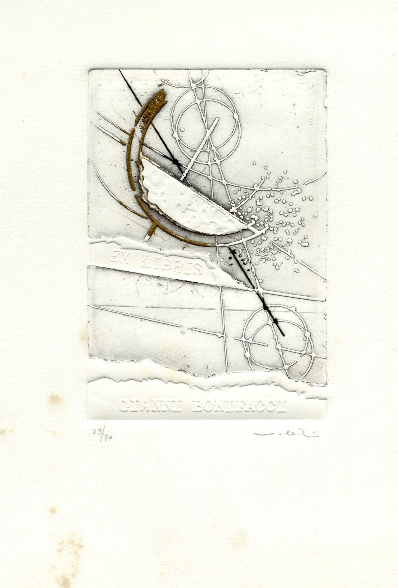1) La mesure, le Ciel. Acquaforte a secco. mm 185x185. Firma a matita in basso a destra e tiratura in basso a sinistra. Opera conservata entro la cartella editoriale originale della Galerie Dionne Es. 110/200. 2) Ex-Libris Gianni Bonifacci. Acquaforte a secco. mm 130x87. Foglio: mm 227x160. Firma a matita in basso a destra e tiratura in basso a sinistra. Es. 29/70. (2) OPERA 1: Ottima conservazione. OPERA 2: Qualche macchiolina in basso a sinistra. Inciso perfetto e corposo.