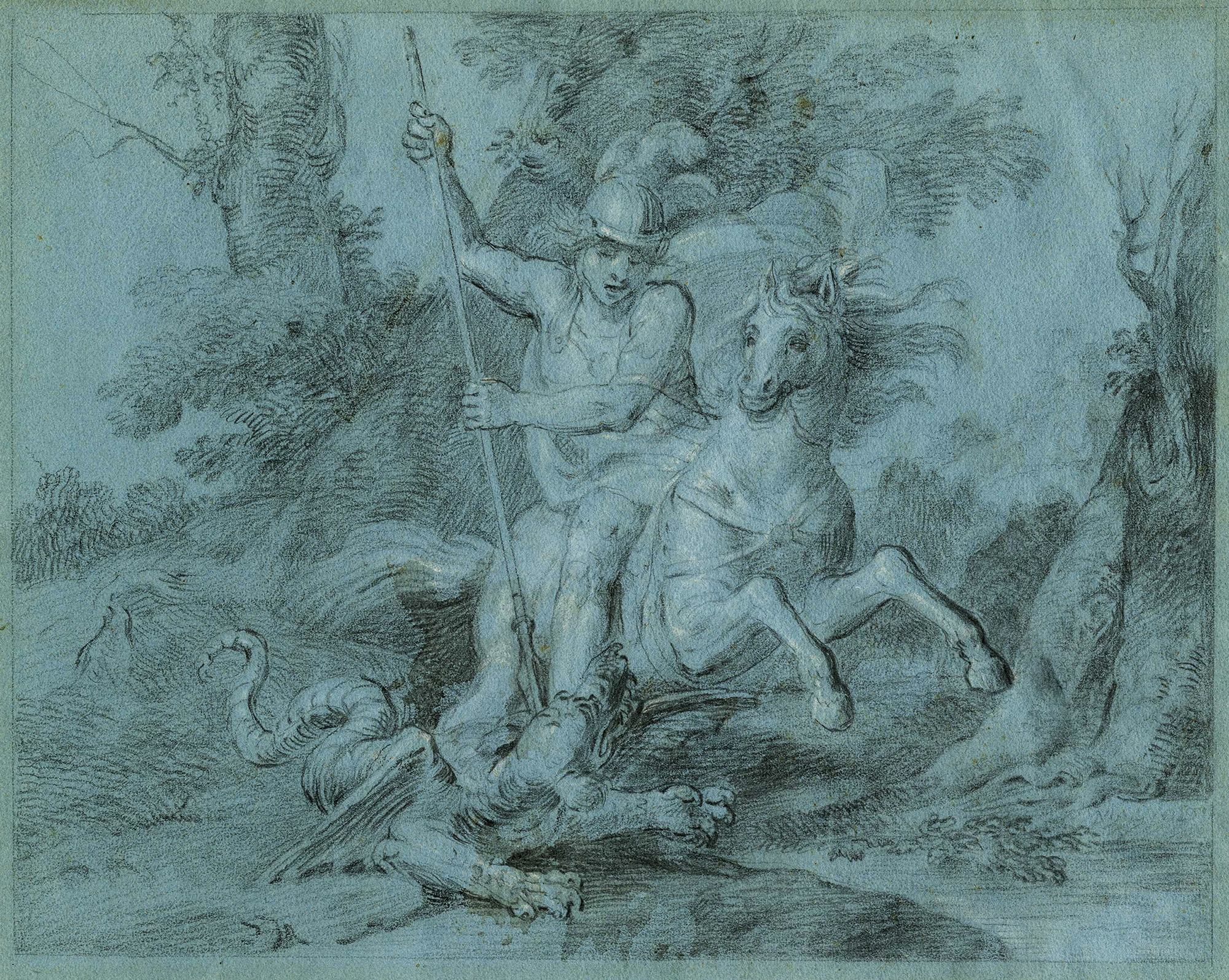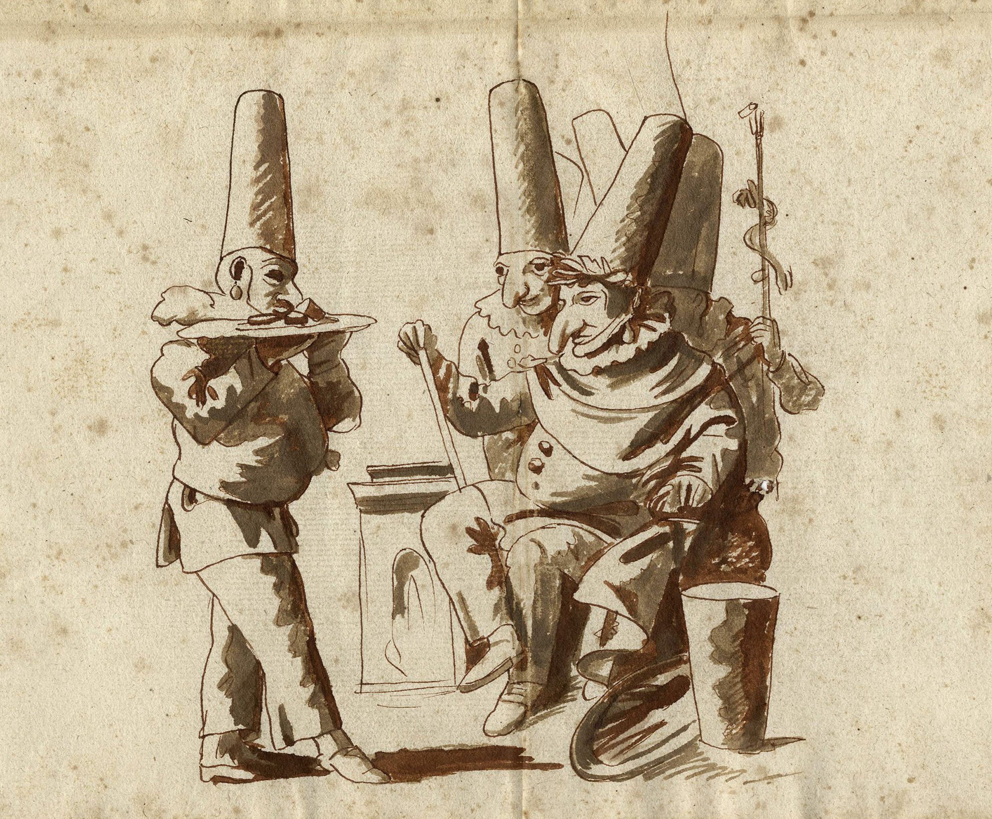 Autori vari, Lotto di quattro disegni. XVIII-XIX secolo 1) Giovanni Battista Tiepolo [da], Un piatto di gnocchi offerto a Pulcinella in veste di podestà (Gnoccolata). Pennello e acquerello rosso scuro su carta vergellata sottile priva di filigrana. mm 205x245. Da un originale conservato al Civico Museo Sartorio di Trieste. 2) Jeanne Peyrières (Francia prima metà XIX secolo), Ver à soie et ses métamorphoses (Il baco da seta e le sue metamorfosi). Matita nera con rialzi in bianco su carta pesante color nocciola scuro. In basso a destra "Jeanne Peyrières" a matita nera. mm 265x174. 3) Anonimo del XVIII secolo, San Giorgio e il drago. Matita nera con minimi rialzi in bianco su carta azzurra apparentemente non vergellata. mm 210x265. 4) Anonimo del XIX secolo, Studio per angelo in volo. Matita di grafite su carta bianca spessa non vergellata. mm 125x85. (4)1) Giovanni Battista Tiepolo [da], Un piatto di gnocchi offerto a Pulcinella in veste di podestà (Gnoccolata). Pennello e acquerello rosso scuro su carta vergellata sottile priva di filigrana. mm 205x245. Da un originale conservato al Civico Museo Sartorio di Trieste. 2) Jeanne Peyrières (Francia prima metà XIX secolo), Ver à soie et ses métamorphoses (Il baco da seta e le sue metamorfosi). Matita nera con rialzi in bianco su carta pesante color nocciola scuro. In basso a destra "Jeanne Peyrières" a matita nera. mm 265x174. 3) Anonimo del XVIII secolo, San Giorgio e il drago. Matita nera con minimi rialzi in bianco su carta azzurra apparentemente non vergellata. mm 210x265. 4) Anonimo del XIX secolo, Studio per angelo in volo. Matita di grafite su carta bianca spessa non vergellata. mm 125x85. (4) OPERA 1: Lieve traccia di alcune pieghe e punti di fioritura. Minimo segno d'uso. OPERA 2: Cartoncino con piccole mancanze a tre angoli e inserito in vecchio montaggio decorato. Con il montaggio: mm 300x238. OPERA 3: Lievissima traccia d'uso. OPERA 4: Foglio inserito in passepartout moderno in cartone pesante verde salvia con sguscio in oro, minimi e sporadici punti di fioritura. Con il montaggio: mm 243x168.