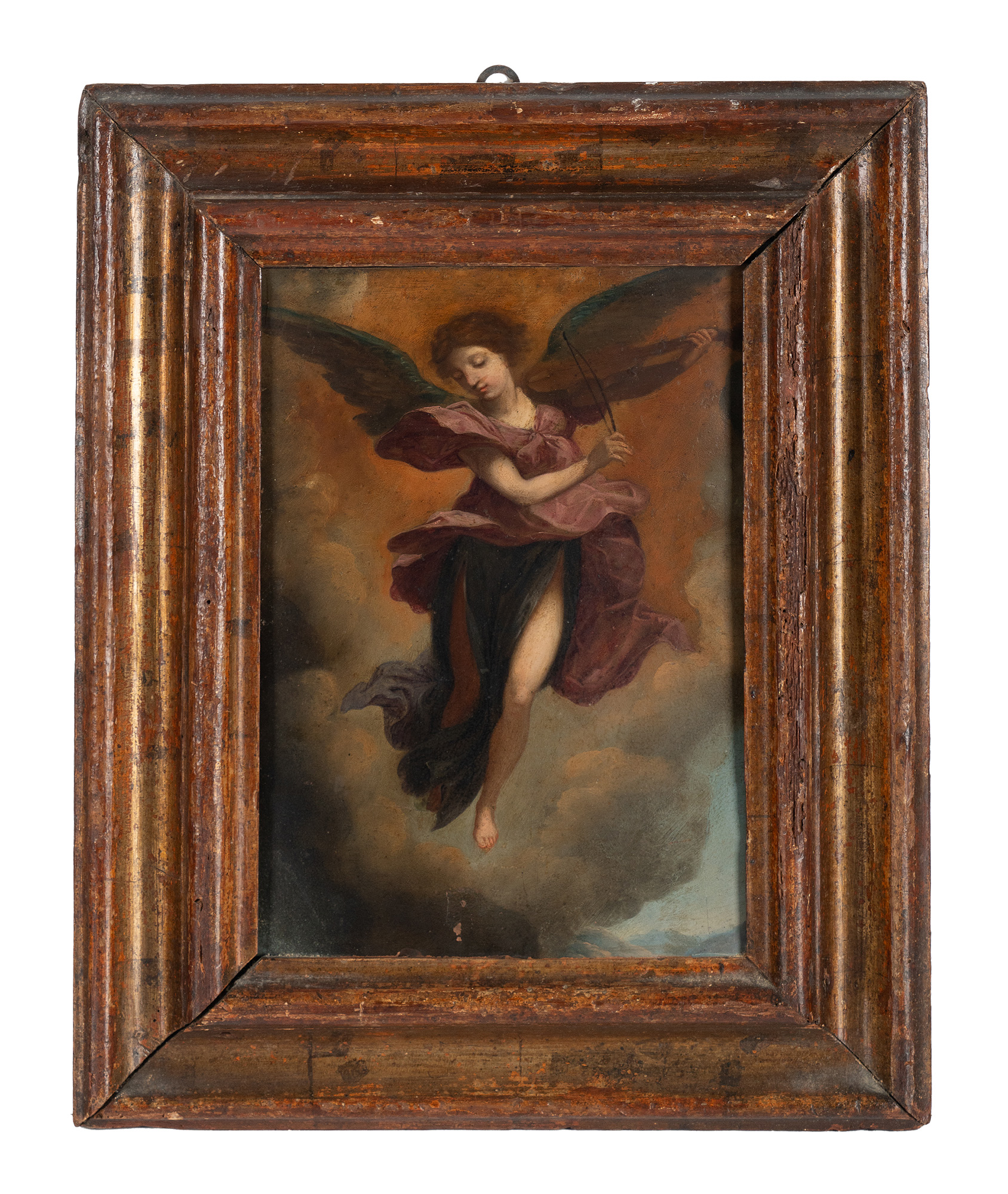 Anonimo del XVII secolo, Angelo musicante. Olio su rame. cm 25x20. (1)Olio su rame. cm 25x20. (1) In vecchia cornice laccata con dorature. Con la cornice: cm 38x30,3.
