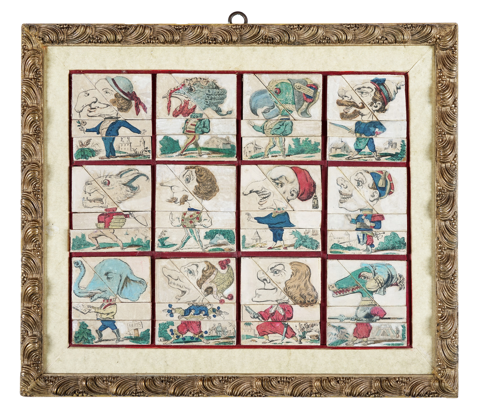 Francia XIX secolo, Kaleîdoscope grotesque. 1850 ca. Gioco composto da 12 personaggi grotteschi in litografia a colori dove ciascuna figura è scomposta e applicata su 4 pezzi di legno da ricomporre (anche in modi diversi scambiando le tessere), all'interno di un tabellone rettangolare con altrettanti alloggi. mm 95x85 (ciascuna casella). mm 360x425 (l'intero tabellone). Tra le figure caricaturali si riconoscono il sultano, il damerino, il guerriero con testa di coccodrillo, il domatore francese con testa di gatto, il prestigiatore, il medico (o veterinario). Non sono presenti il nome dello stampatore e quello del rivenditore. (1)Gioco composto da 12 personaggi grotteschi in litografia a colori dove ciascuna figura è scomposta e applicata su 4 pezzi di legno da ricomporre (anche in modi diversi scambiando le tessere), all'interno di un tabellone rettangolare con altrettanti alloggi. mm 95x85 (ciascuna casella). mm 360x425 (l'intero tabellone). Tra le figure caricaturali si riconoscono il sultano, il damerino, il guerriero con testa di coccodrillo, il domatore francese con testa di gatto, il prestigiatore, il medico (o veterinario). Non sono presenti il nome dello stampatore e quello del rivenditore. (1) Alcuni segni d'uso. In vecchia cornice dorata. Con la cornice: cm 40,5x47,5.