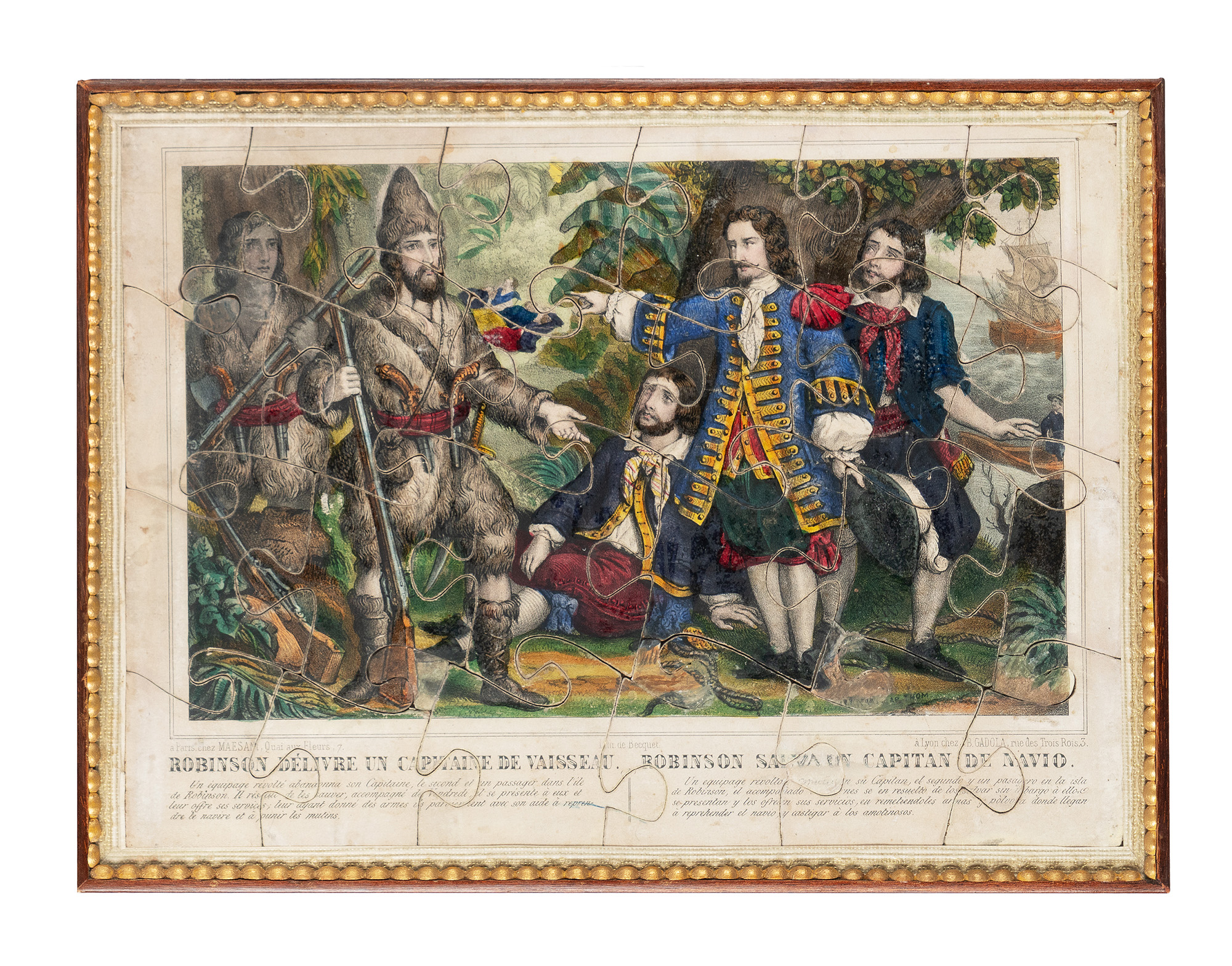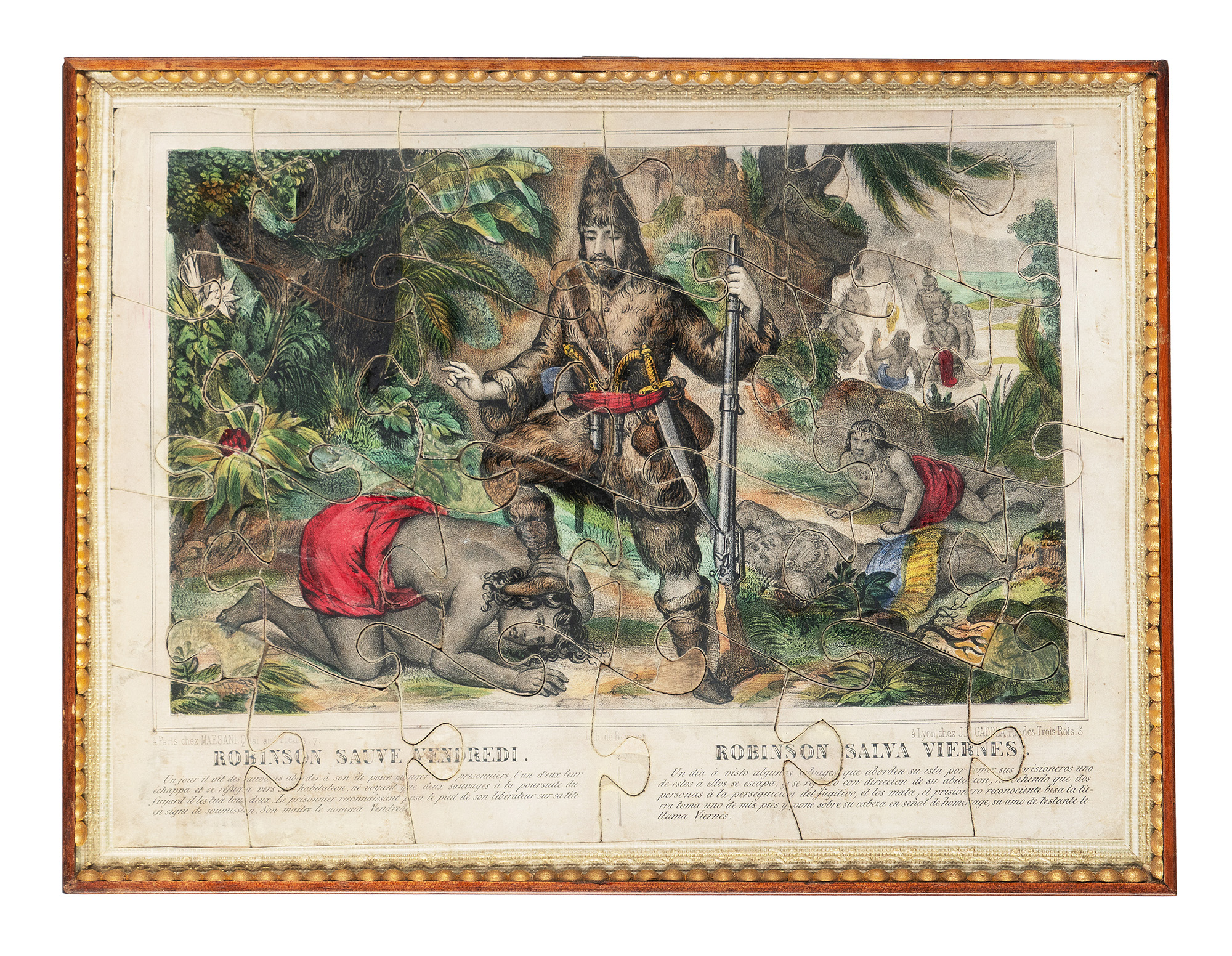 Becquet Frères (Imprimeur à Paris entre les années 1850 et 1880), Robinson délivre un capitaine de vaisseau - Robinson salva un capitan de navio / Robinson sauve Vendredi - Robinson salva Viernes. A Paris chez Maesani, Quai aux Fleus, 7 / à Lyon chez J.B. Gadola, rue des Trois Rois, 3. 1850 ca. Litografia a colori. mm 235x323. Thomas Napoleon (1804-1879) disegnatore, Adolphe Best (1808-1879) incisore. Due tavole con illustrazioni per il romanzo di Daniel Defoe, The Life and Strange Surprising Adventures of Robinson Crusoe, meglio noto come Le avventure di Robinson Crusoe, pubblicato il 25 aprile 1719. Al margine in basso il titolo, in francese e in spagnolo, e al di sotto alcune righe nella medesima lingua che descrivono l'episodio. Le due tavole risalgono alla metà del XIX secolo o poco oltre, sono state applicate su tavoletta di legno e sezionate in tessere da incastrare tra di loro per realizzare due puzzle. (2)Litografia a colori. mm 235x323. Thomas Napoleon (1804-1879) disegnatore, Adolphe Best (1808-1879) incisore. Due tavole con illustrazioni per il romanzo di Daniel Defoe, The Life and Strange Surprising Adventures of Robinson Crusoe, meglio noto come Le avventure di Robinson Crusoe, pubblicato il 25 aprile 1719. Al margine in basso il titolo, in francese e in spagnolo, e al di sotto alcune righe nella medesima lingua che descrivono l'episodio. Le due tavole risalgono alla metà del XIX secolo o poco oltre, sono state applicate su tavoletta di legno e sezionate in tessere da incastrare tra di loro per realizzare due puzzle. (2) Segni d'uso e difetti. In vecchie cornici in legno. Con le cornici: cm 26,5x35,2.