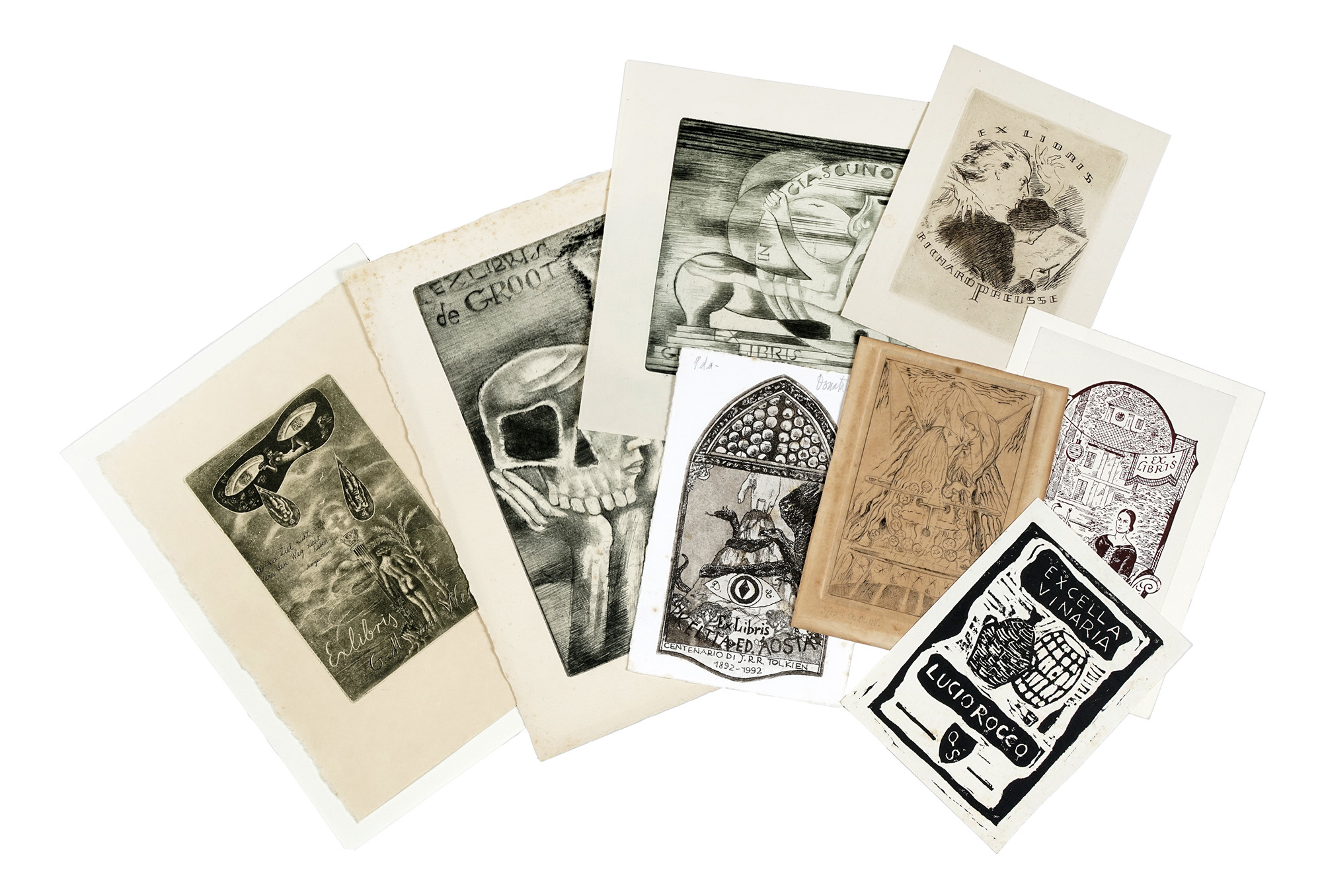 Autori vari, Lotto composto di 38 ex libris. Raccolta di acqueforti, fotoincisioni, xilografie e litografie. mm 65/190x42/120. Fogli: mm 80/235x55/180. Molte firmate e datate in lastra lungo i margini, alcune controfirmate a matita. Tra i vari autori spiccano: Martini A., Fingesten M., Ferenzona R. D. M., Balsamo Stella G. e Sartorio G. A. (38)Raccolta di acqueforti, fotoincisioni, xilografie e litografie. mm 65/190x42/120. Fogli: mm 80/235x55/180. Molte firmate e datate in lastra lungo i margini, alcune controfirmate a matita. Tra i vari autori spiccano: Martini A., Fingesten M., Ferenzona R. D. M., Balsamo Stella G. e Sartorio G. A. (38) Alcune opere totalmente o parzialmente applicate su carta di supporto. Trascurabili bruniture leggere e sporadiche fioriture. Buona conservazione generale.