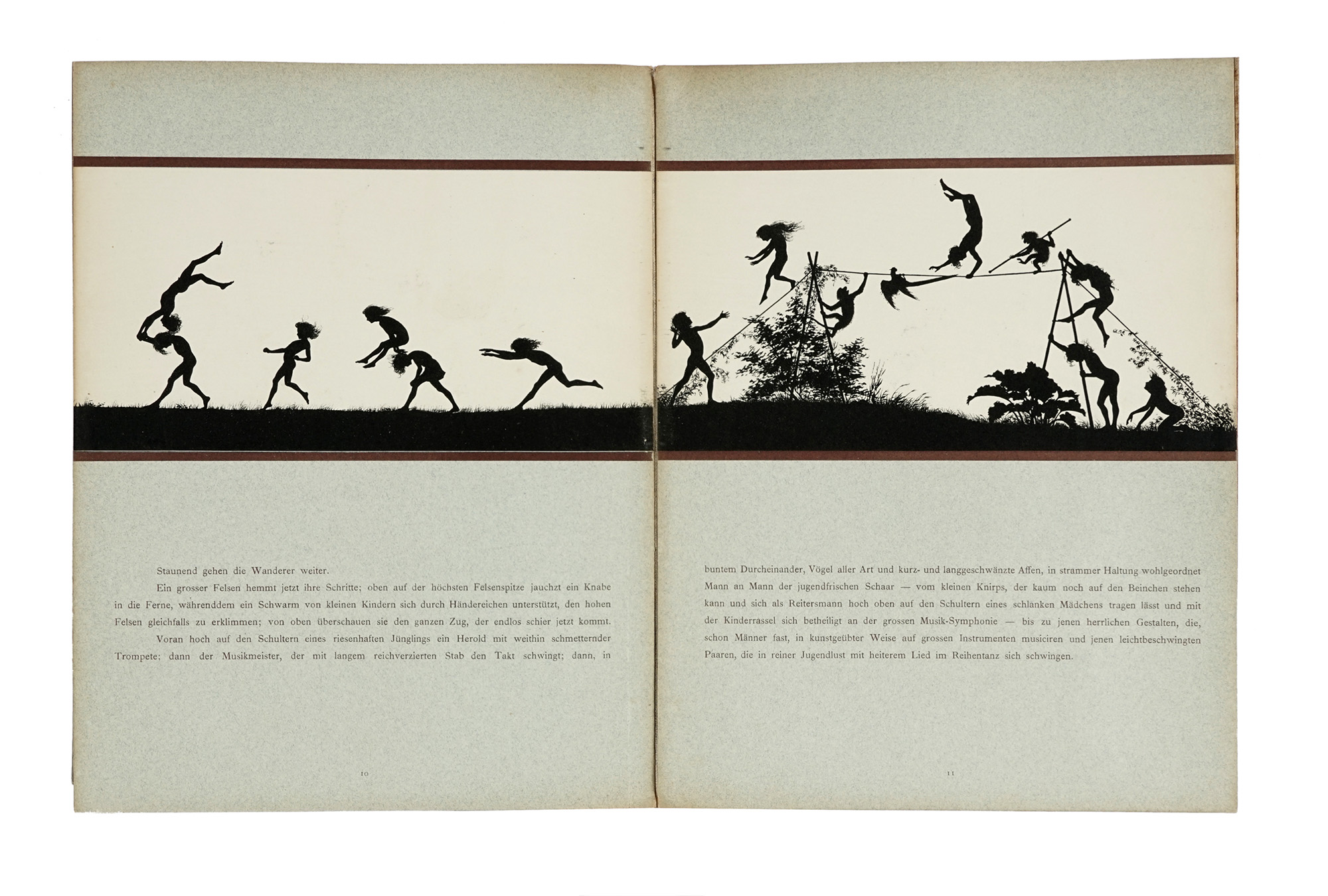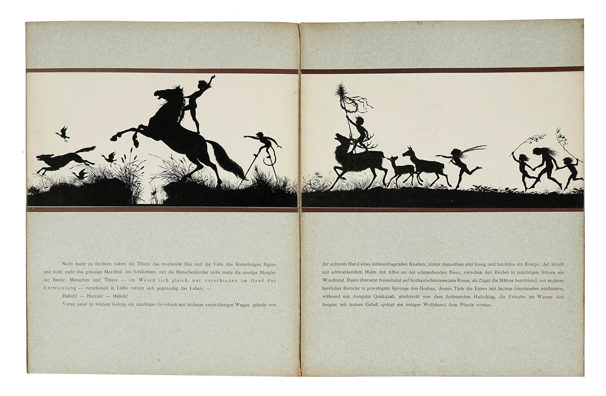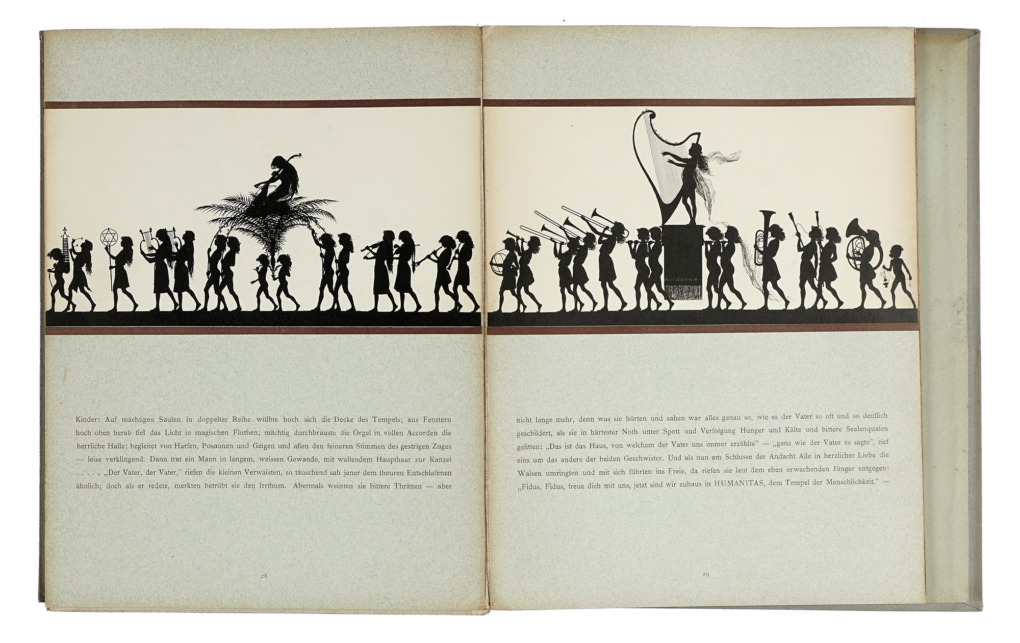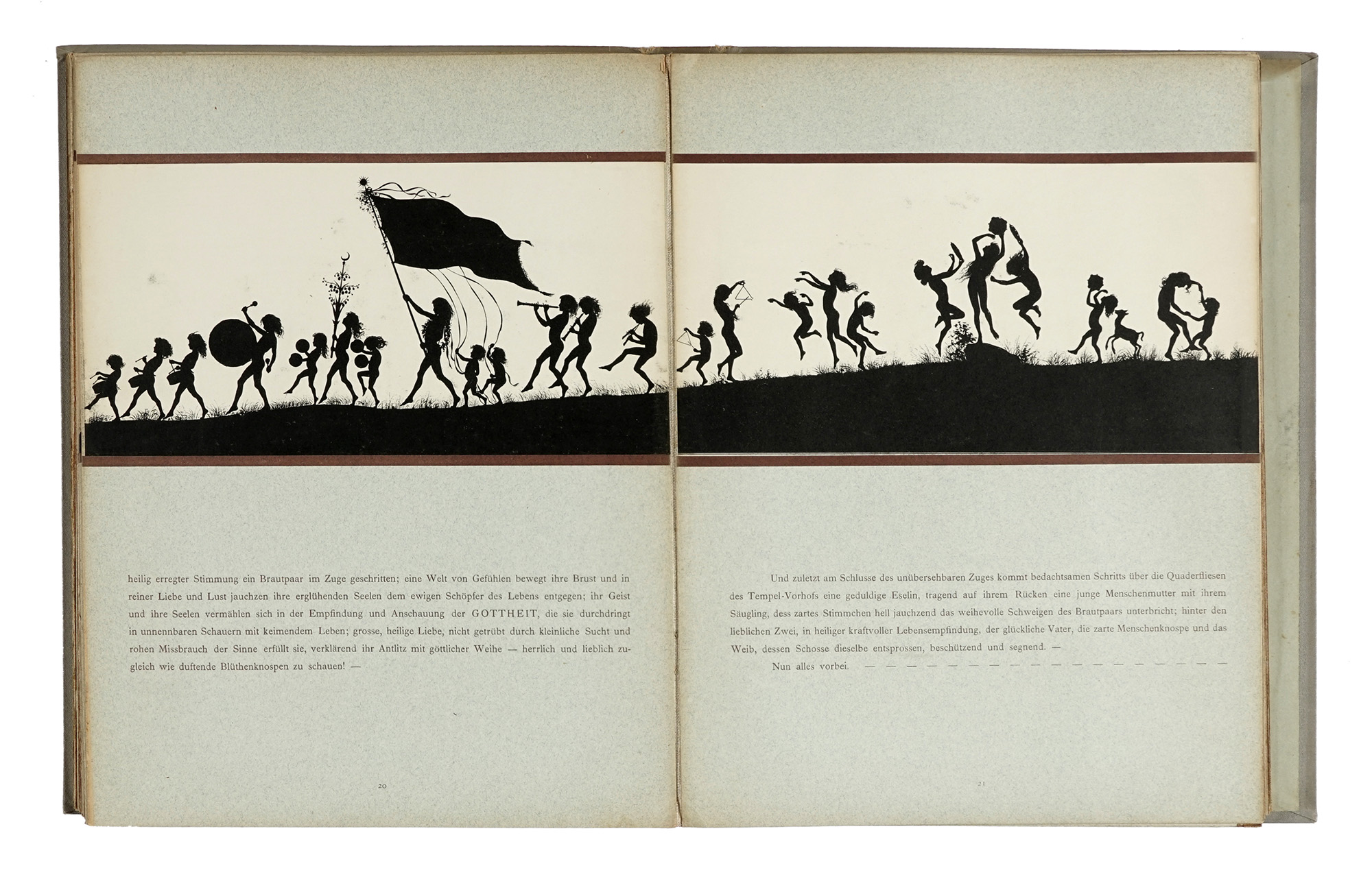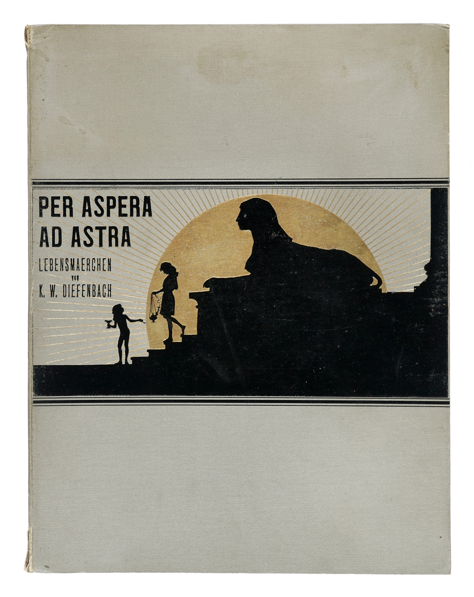 Karl Wilhelm Diefenbach, Per Aspera ad Astra. Ein Liebensmärchen von Karl Wilhelm Diefenbach. Wien, Verlag von V. A. Heck,1893. In-4° (mm 330x250), Pagine [4] di testo e 34 tavole illustrate a silhouettes in nero su strisce applicate su cartoncini rigidi di mm 120 di altezza, stampate in litografia a leporello, che tutte unite e ripiegate illustrano un corteo nel quale l'artista poeta e iniziato é accompagnato da una moltitudine di fanciulli festanti e animali. Testo in tedesco in basso per tutta la lunghezza delle tavole. Legatura editoriale in piena tela con una incisione in nero e oro al piatto anteriore. Edizione originale di questo affascinante volume che riproduce in litografia il fregio Per Aspera ad Astra lungo nell'originale 68 metri, realizzato da Diefenbach nel 1875. (1)In-4° (mm 330x250), Pagine [4] di testo e 34 tavole illustrate a silhouettes in nero su strisce applicate su cartoncini rigidi di mm 120 di altezza, stampate in litografia a leporello, che tutte unite e ripiegate illustrano un corteo nel quale l'artista poeta e iniziato é accompagnato da una moltitudine di fanciulli festanti e animali. Testo in tedesco in basso per tutta la lunghezza delle tavole. Legatura editoriale in piena tela con una incisione in nero e oro al piatto anteriore. Edizione originale di questo affascinante volume che riproduce in litografia il fregio Per Aspera ad Astra lungo nell'originale 68 metri, realizzato da Diefenbach nel 1875. (1) Minimi difetti, lievi tracce di usura alla costola. Altrimenti ben conservato.