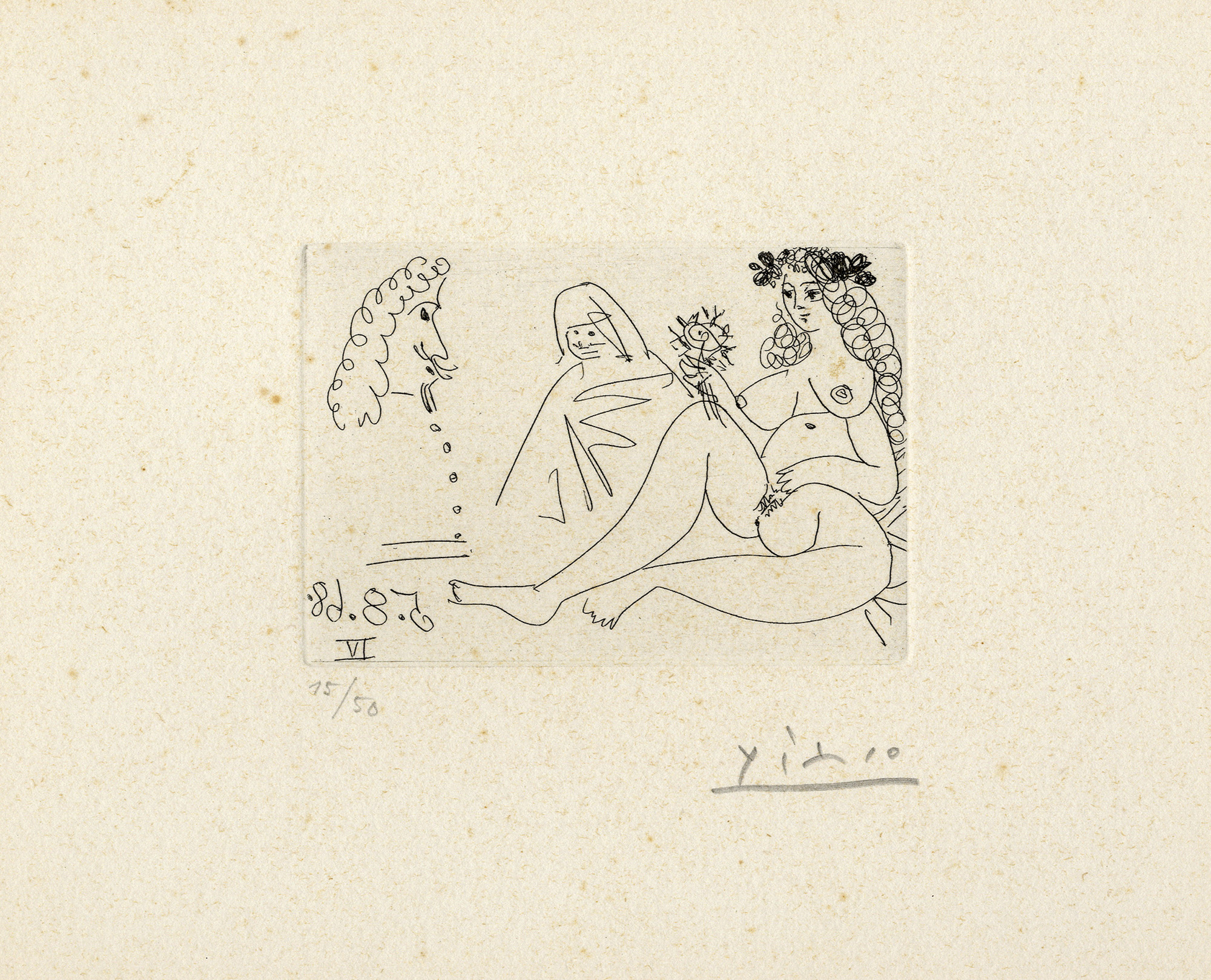 Pablo Picasso, Tavola da La Célestine. 1968. Acquaforte. mm 60x85. Foglio: mm 254x330. bloch, 1729. Firma a matita in basso a destra, tiratura in basso a sinistra. Data in controparte in lastra in basso a destra. Es. 15/50. (1)Acquaforte. mm 60x85. Foglio: mm 254x330. bloch, 1729. Firma a matita in basso a destra, tiratura in basso a sinistra. Data in controparte in lastra in basso a destra. Es. 15/50. (1) Fogli applicato a passe-partout. Macchioline ma impressione corposa. Molto rara.