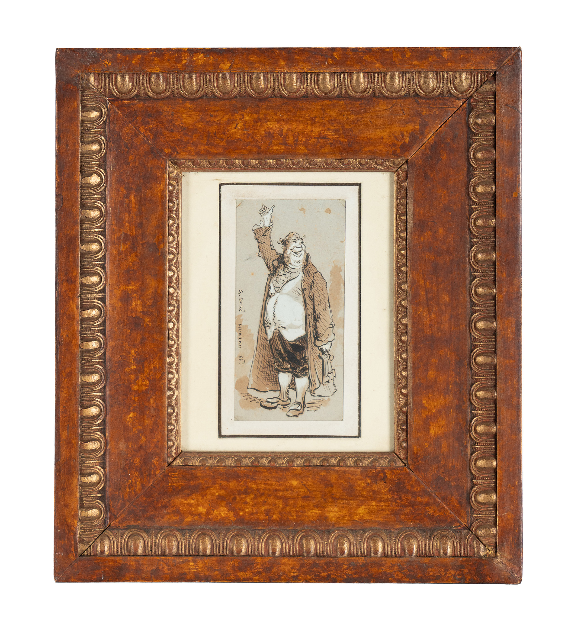Gustave Doré, Disegno preparatorio per l'illustrazione del Barone di Münchhausen. 1862. Acquerello, penna e inchiostro di china su carta. mm 125x60. Nome dell'artista, diminutivo del luogo e numero iscritti al margine sinistro. (1)Acquerello, penna e inchiostro di china su carta. mm 125x60. Nome dell'artista, diminutivo del luogo e numero iscritti al margine sinistro. (1) Foglio applicato a passe-partout. In cornice: cm 30x26. Ottima conservazione.