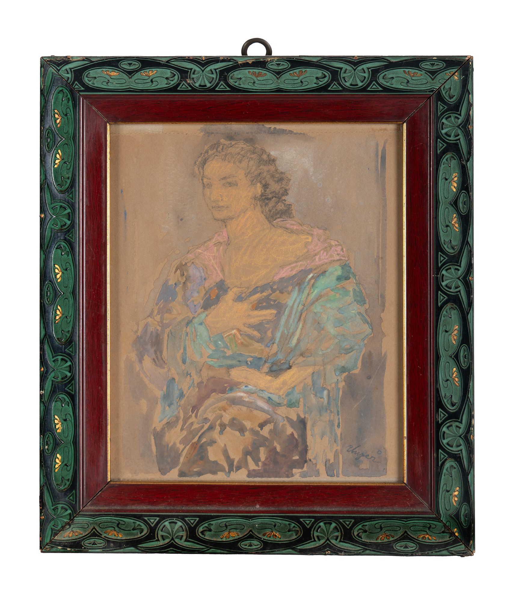 Hans Unger, Figura femminile. Fine del XIX secolo. Acquerello e carboncino su carta. mm 240x195. Firma in basso a destra. Al verso è segnata la provenienza manoscritta dalla Galleria dell'Incisione di Brescia. (1)Acquerello e carboncino su carta. mm 240x195. Firma in basso a destra. Al verso è segnata la provenienza manoscritta dalla Galleria dell'Incisione di Brescia. (1) In bellissima cornice liberty: cm 33x29. Manca una parte di supporto in alto a sinistra.