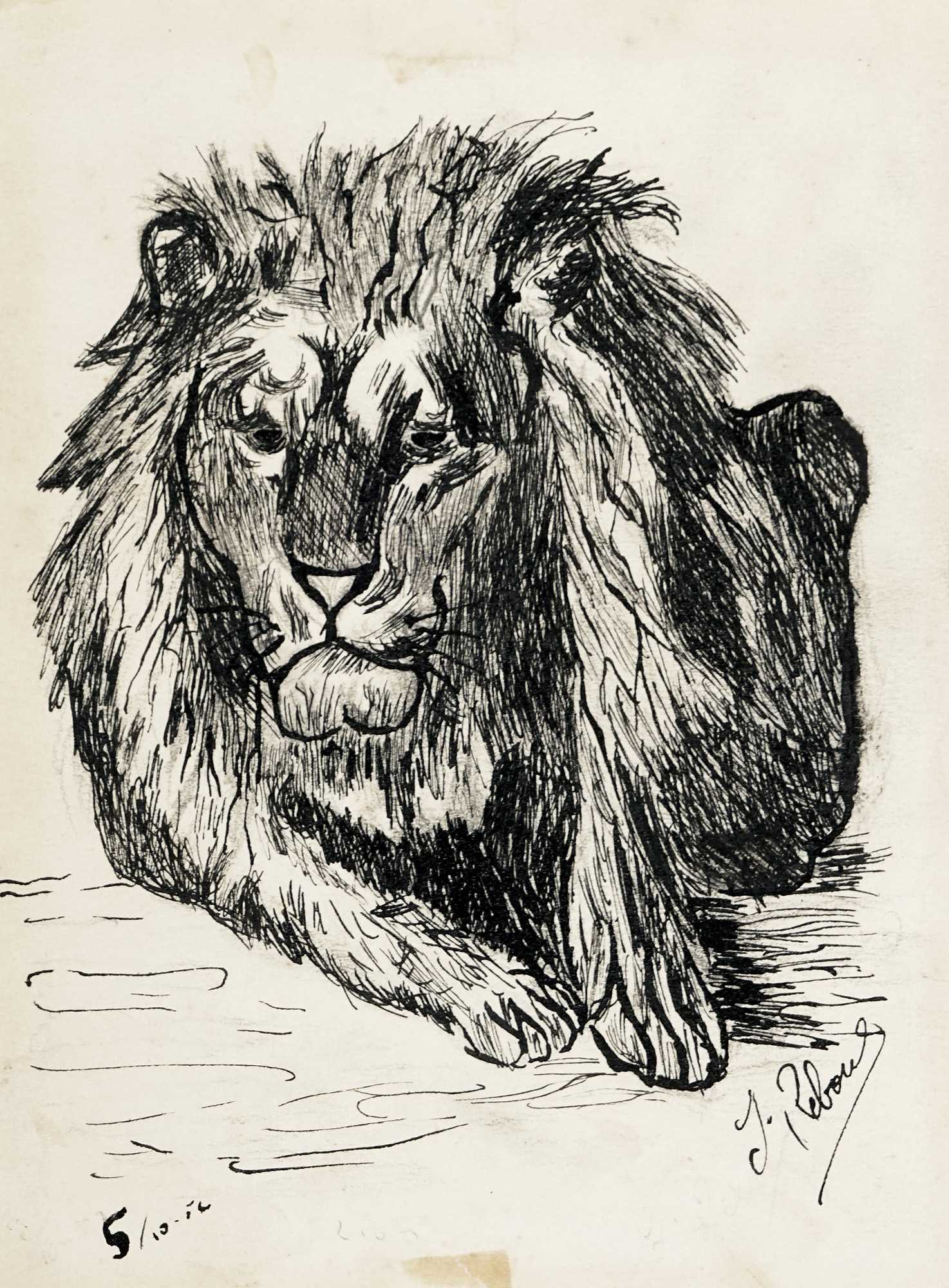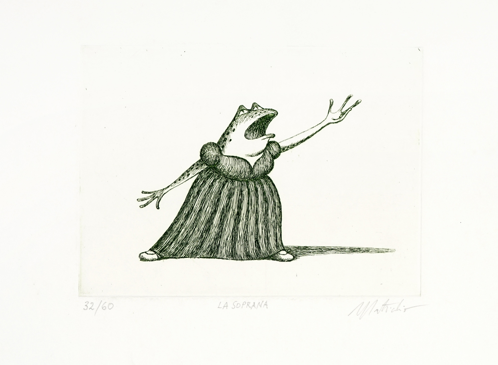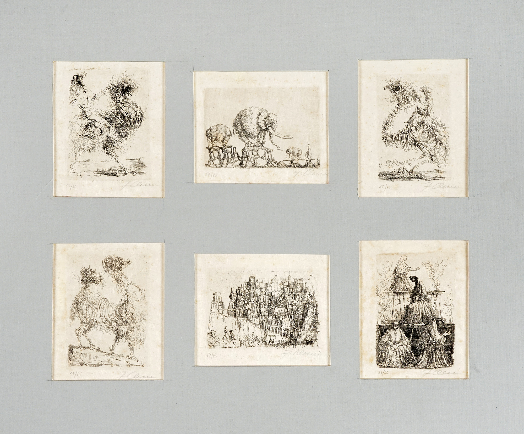 Autori vari, Lotto composto di 25 incisioni e disegni a tema animale. 1900. 1) Levy M., Due gatti su una sedia. 1915. Acquaforte e puntasecca. mm 118x150. Foglio: 165x195. Passe par tout: mm 181x234. Firmata e datata all'interno della lastra vicino all'angolo inferiore sinistro. Firmata a matita nell'angolo in basso a destra. 2) Clerici F., L'ariete. 1975. Litografia. mm 185x176. Foglio: mm 276x205. Firmata a matita in basso a destra sotto la lastra. Timbrata a secco nell'angolo inferiore sinistro del foglio. 3) Clerici F., Illustrazioni. Sei piccole acqueforti di soggetto vario. mm 59x79 ca cad. Fogli: mm 112x81 ca cad. Tutte firmate a matita nell'angolo in basso a destra e numerate nell'angolo in basso a sinistra. Tutte es 67/85. 4) Dal Molin Ferenzona R., Tangara rossa. Gazza marina. Ciuffolo. Due acqueforti acquerellate. mm 178x140 cad. Fogli: mm 295x210 cad. Passe-partout: mm 324x431. Entrambe monogrammate e titolate all'interno della lastra: i titoli sono collocati lungo il margine inferiore in entrambe le raffigurazioni. Il monogramma di Tangara rossa. Gazza marina è collocato nell'angolo in basso a sinistra, quello di Ciuffolo nell'angolo in basso a destra. 5) Laske O., Daniele nella tana dei leoni. 1912. Acquaforte. mm 174x114. Foglio: mm 400x300. All'interno della lastra, siglata nell'angolo in basso a sinistra e titolata lungo il margine inferiore sul lato destro. Lungo il margine inferiore sono stati stampati, rispettivamente a sinistra, al centro e a destra: autore e titolo, indicazione della tipografia, casa editrice. 6) Bracquemond F., L'inconnu. Acquaforte. mm 181x316. Foglio: mm 350x520. Monogrammata nella lastra nell'angolo in basso a destra. Indicazione dell'artista nell'angolo in basso a sinistra e dell'incisore a destra. Titolo ed informazioni editoriali in basso al centro. Timbrata a secco al centro sotto la lastra. 7) Mérodack-Jeanneau A., Senza titolo. Due disegni a inchiostro su carta applicati sullo stesso supporto. mm 104x204 cad. Supporto: mm 401x300. Entrambi i disegni sono firmati lungo i margini inferiori. Nel disegno raffigurante i tacchini, nell'angolo in alto a destra è presente una scritta non identificata. 8) Olshausen-Schönberger K., Senza titolo. 1909. China su carta. mm 352x472. Firmata e datata nell'angolo in basso a destra. 9) Guarienti C., Rinoceronte. 1980. Litografia. mm 478x328. Foglio: mm 688x494. All'interno della lastra, a matita, compare la firma "Soavi". Firmata dall'artista a matita nell'angolo in basso a destra, numerata nell'angolo in basso a sinistra, assieme ad una dedica "a Marisa, i tuoi amici". Es 87/90. 10) Carlini S., Studi di storia naturale: il ranocchio. Matita su carta avorio. mm 205x180. 11) Durand A., Autour de l'auge (da August Friedrich Schenck). Acquaforte. mm 118x220. Foglio: mm 175x285. Passe par tout: mm 232x291. Firmata all'interno della lastra nell'angolo in basso a destra. Sotto alla lastra, nell'angolo in basso a sinistra è riportato il nome dell'autore e in quello in basso a destra quello dell'incisore. Titolata in basso al centro. Sotto al titolo nell'angolo in basso a sinistra "Gazette des Beaux-Arts" e in quello a destra "Imp. A. Salmon Paris". 12) Landser T., A large monkey dressed in rags is about to beat a smaller monkey with a bundle of brushwood. 1827. Acquaforte su carta applicata. mm 197x162. Foglio: mm 224x176. Monogrammata nell'angolo in basso a destra. 13) Tofanari S., Orso. Matita su carta. mm 323x325. Siglata in basso a destra. 14) Thoma H., Wundervogel. 1911. Acquaforte e puntasecca. mm 197x243. Foglio: mm 328x370. Monogrammata e datata nell'angolo in basso a sinistra. Firmata a matita nell'angolo in basso a destra. 15) Lazzeri C., Vitello. 1845. Matita su carta. mm 213x275. Firmata e datata nell'angolo in basso a sinistra. 16) Gadda C., Senza titolo. 1971. Penna a sfera su carta. mm 112x104. Firmata e datata in basso al centro (oltre all'anno è presente anche il giorno "15-I"). 17) Matticchio F., La sop-rana. Acquaforte. mm 125x171. Foglio: mm 243x347. Firmata a matita in basso a destra, titolata al centro e numerata in basso a sinistra. Es 32/60. 18) Matticchio F., Senza titolo. Acquaforte. mm 84x143. Foglio: mm 179x235. Firmata a matita in basso a destra e numerata in basso a sinistra. Es 4/50. 19) Artista non identificato, Senza titolo. 1961. Acquaforte. mm 82x136. Foglio: mm 116x156. Firmata e datata all'interno della lastra nell'angolo in basso a destra "P. Di Pietro. Natale 1961". Firmata a matita nell'angolo in basso a destra fuori dalla lastra. Si tratta di un'acquaforte stampata sulla copertina di un biglietto d'auguri, contenente al suo interno la scritta "Firenze, Natale '61. Buon anno da tutti" e una firma. 20) Autore non identificato, Conigli. Acquaforte. mm 129x131. Foglio: 265x385. Firmata a matita nell'angolo in basso a destra, titolata al centro e "p.d.a." in basso a sinistra. Timbrata a secco nell'angolo in basso a destra del foglio. 21) Anonimo, Asino. Acquaforte. mm 170x139. Foglio: mm 346x247. Nella lastra, lungo il margine inferiore, è presente la scritta "Mirati, Amico, in me: sono uno specchio: / Divario altro non v'è, che nell'orecchio". 22) Norfini M., Beccaccia. 1922. Matita su carta. mm 197x160. Firmata e datata nell'angolo in basso a sinistra. 23) Autore non identificato, Senza titolo. 1959. Matita su carta. mm 143x216. Firmata e datata nell'angolo in basso a destra. 24) Autore non identificato, Leone. 1952. Inchiostro su carta. mm 156x116. Firmato nell'angolo in basso a destra, datato "5/10/52" in basso a sinistra. 25) Autore non identificato, Senza titolo. 1922. Inchiostro e acquerello su carta. mm 282x397. Firmato e datato in basso a destra. (25)1) Levy M., Due gatti su una sedia. 1915. Acquaforte e puntasecca. mm 118x150. Foglio: 165x195. Passe par tout: mm 181x234. Firmata e datata all'interno della lastra vicino all'angolo inferiore sinistro. Firmata a matita nell'angolo in basso a destra. 2) Clerici F., L'ariete. 1975. Litografia. mm 185x176. Foglio: m
