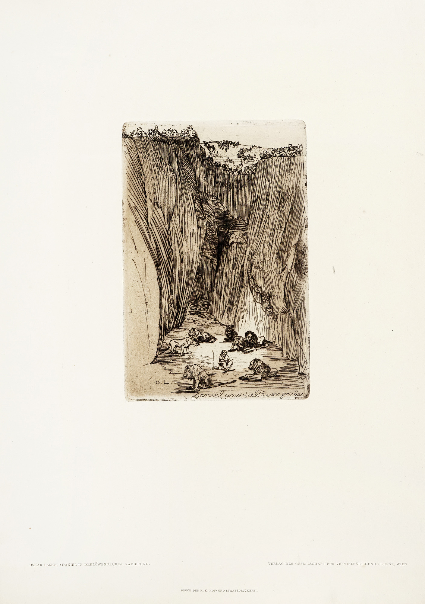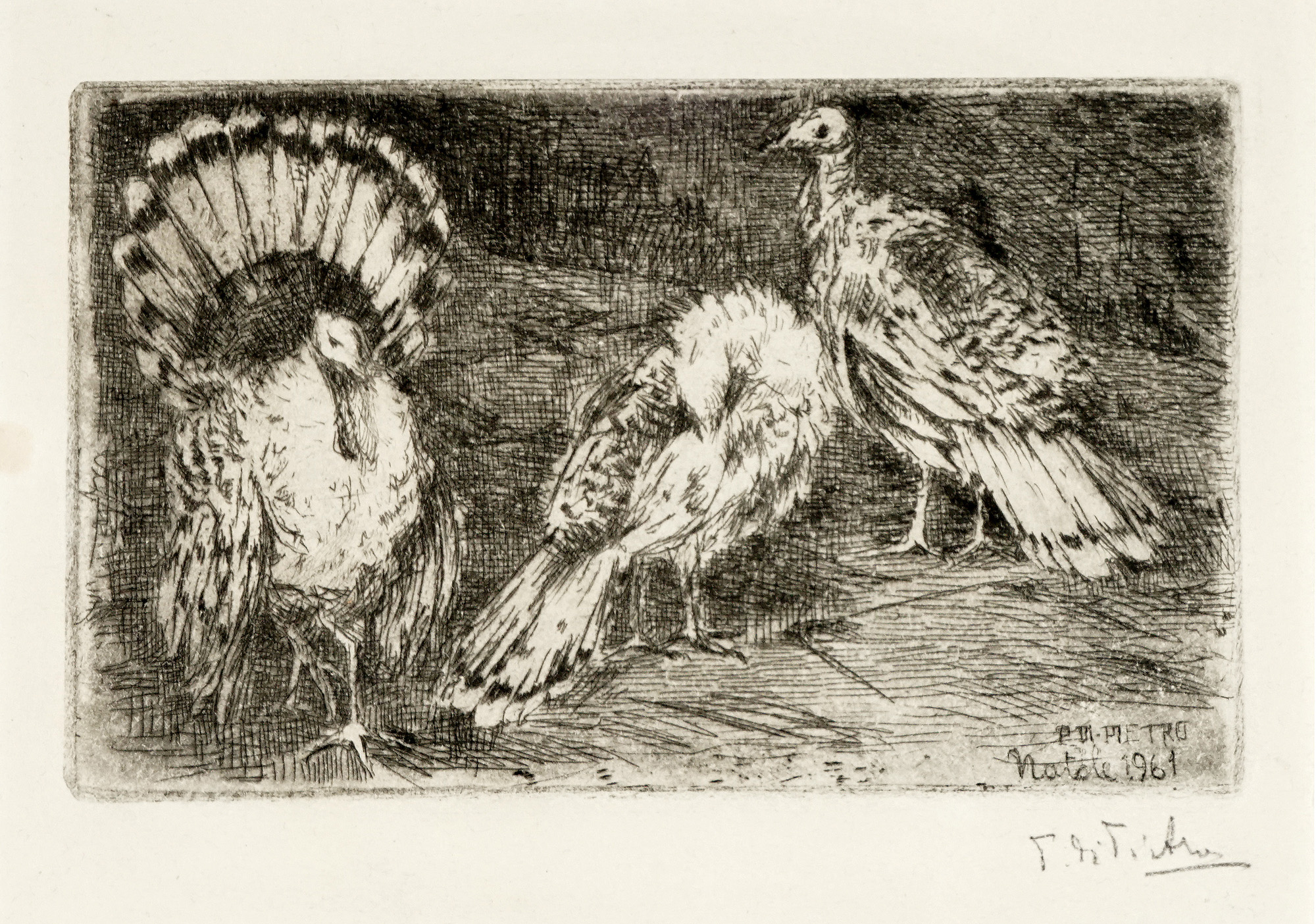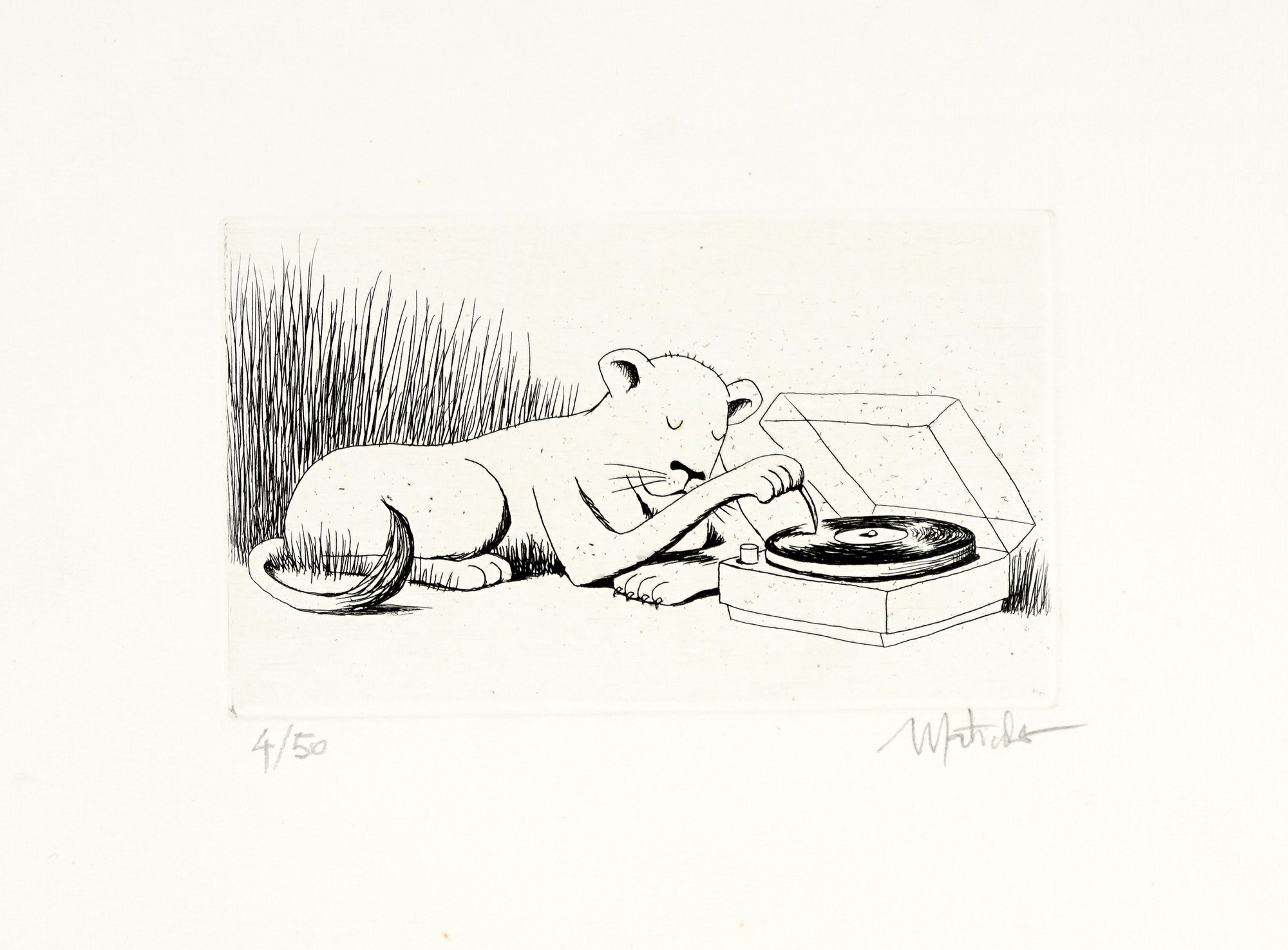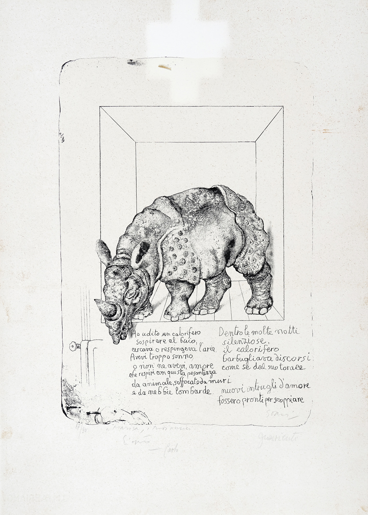 Autori vari, Lotto composto di 25 incisioni e disegni a tema animale. 1900. 1) Levy M., Due gatti su una sedia. 1915. Acquaforte e puntasecca. mm 118x150. Foglio: 165x195. Passe par tout: mm 181x234. Firmata e datata all'interno della lastra vicino all'angolo inferiore sinistro. Firmata a matita nell'angolo in basso a destra. 2) Clerici F., L'ariete. 1975. Litografia. mm 185x176. Foglio: mm 276x205. Firmata a matita in basso a destra sotto la lastra. Timbrata a secco nell'angolo inferiore sinistro del foglio. 3) Clerici F., Illustrazioni. Sei piccole acqueforti di soggetto vario. mm 59x79 ca cad. Fogli: mm 112x81 ca cad. Tutte firmate a matita nell'angolo in basso a destra e numerate nell'angolo in basso a sinistra. Tutte es 67/85. 4) Dal Molin Ferenzona R., Tangara rossa. Gazza marina. Ciuffolo. Due acqueforti acquerellate. mm 178x140 cad. Fogli: mm 295x210 cad. Passe-partout: mm 324x431. Entrambe monogrammate e titolate all'interno della lastra: i titoli sono collocati lungo il margine inferiore in entrambe le raffigurazioni. Il monogramma di Tangara rossa. Gazza marina è collocato nell'angolo in basso a sinistra, quello di Ciuffolo nell'angolo in basso a destra. 5) Laske O., Daniele nella tana dei leoni. 1912. Acquaforte. mm 174x114. Foglio: mm 400x300. All'interno della lastra, siglata nell'angolo in basso a sinistra e titolata lungo il margine inferiore sul lato destro. Lungo il margine inferiore sono stati stampati, rispettivamente a sinistra, al centro e a destra: autore e titolo, indicazione della tipografia, casa editrice. 6) Bracquemond F., L'inconnu. Acquaforte. mm 181x316. Foglio: mm 350x520. Monogrammata nella lastra nell'angolo in basso a destra. Indicazione dell'artista nell'angolo in basso a sinistra e dell'incisore a destra. Titolo ed informazioni editoriali in basso al centro. Timbrata a secco al centro sotto la lastra. 7) Mérodack-Jeanneau A., Senza titolo. Due disegni a inchiostro su carta applicati sullo stesso supporto. mm 104x204 cad. Supporto: mm 401x300. Entrambi i disegni sono firmati lungo i margini inferiori. Nel disegno raffigurante i tacchini, nell'angolo in alto a destra è presente una scritta non identificata. 8) Olshausen-Schönberger K., Senza titolo. 1909. China su carta. mm 352x472. Firmata e datata nell'angolo in basso a destra. 9) Guarienti C., Rinoceronte. 1980. Litografia. mm 478x328. Foglio: mm 688x494. All'interno della lastra, a matita, compare la firma "Soavi". Firmata dall'artista a matita nell'angolo in basso a destra, numerata nell'angolo in basso a sinistra, assieme ad una dedica "a Marisa, i tuoi amici". Es 87/90. 10) Carlini S., Studi di storia naturale: il ranocchio. Matita su carta avorio. mm 205x180. 11) Durand A., Autour de l'auge (da August Friedrich Schenck). Acquaforte. mm 118x220. Foglio: mm 175x285. Passe par tout: mm 232x291. Firmata all'interno della lastra nell'angolo in basso a destra. Sotto alla lastra, nell'angolo in basso a sinistra è riportato il nome dell'autore e in quello in basso a destra quello dell'incisore. Titolata in basso al centro. Sotto al titolo nell'angolo in basso a sinistra "Gazette des Beaux-Arts" e in quello a destra "Imp. A. Salmon Paris". 12) Landser T., A large monkey dressed in rags is about to beat a smaller monkey with a bundle of brushwood. 1827. Acquaforte su carta applicata. mm 197x162. Foglio: mm 224x176. Monogrammata nell'angolo in basso a destra. 13) Tofanari S., Orso. Matita su carta. mm 323x325. Siglata in basso a destra. 14) Thoma H., Wundervogel. 1911. Acquaforte e puntasecca. mm 197x243. Foglio: mm 328x370. Monogrammata e datata nell'angolo in basso a sinistra. Firmata a matita nell'angolo in basso a destra. 15) Lazzeri C., Vitello. 1845. Matita su carta. mm 213x275. Firmata e datata nell'angolo in basso a sinistra. 16) Gadda C., Senza titolo. 1971. Penna a sfera su carta. mm 112x104. Firmata e datata in basso al centro (oltre all'anno è presente anche il giorno "15-I"). 17) Matticchio F., La sop-rana. Acquaforte. mm 125x171. Foglio: mm 243x347. Firmata a matita in basso a destra, titolata al centro e numerata in basso a sinistra. Es 32/60. 18) Matticchio F., Senza titolo. Acquaforte. mm 84x143. Foglio: mm 179x235. Firmata a matita in basso a destra e numerata in basso a sinistra. Es 4/50. 19) Artista non identificato, Senza titolo. 1961. Acquaforte. mm 82x136. Foglio: mm 116x156. Firmata e datata all'interno della lastra nell'angolo in basso a destra "P. Di Pietro. Natale 1961". Firmata a matita nell'angolo in basso a destra fuori dalla lastra. Si tratta di un'acquaforte stampata sulla copertina di un biglietto d'auguri, contenente al suo interno la scritta "Firenze, Natale '61. Buon anno da tutti" e una firma. 20) Autore non identificato, Conigli. Acquaforte. mm 129x131. Foglio: 265x385. Firmata a matita nell'angolo in basso a destra, titolata al centro e "p.d.a." in basso a sinistra. Timbrata a secco nell'angolo in basso a destra del foglio. 21) Anonimo, Asino. Acquaforte. mm 170x139. Foglio: mm 346x247. Nella lastra, lungo il margine inferiore, è presente la scritta "Mirati, Amico, in me: sono uno specchio: / Divario altro non v'è, che nell'orecchio". 22) Norfini M., Beccaccia. 1922. Matita su carta. mm 197x160. Firmata e datata nell'angolo in basso a sinistra. 23) Autore non identificato, Senza titolo. 1959. Matita su carta. mm 143x216. Firmata e datata nell'angolo in basso a destra. 24) Autore non identificato, Leone. 1952. Inchiostro su carta. mm 156x116. Firmato nell'angolo in basso a destra, datato "5/10/52" in basso a sinistra. 25) Autore non identificato, Senza titolo. 1922. Inchiostro e acquerello su carta. mm 282x397. Firmato e datato in basso a destra. (25)1) Levy M., Due gatti su una sedia. 1915. Acquaforte e puntasecca. mm 118x150. Foglio: 165x195. Passe par tout: mm 181x234. Firmata e datata all'interno della lastra vicino all'angolo inferiore sinistro. Firmata a matita nell'angolo in basso a destra. 2) Clerici F., L'ariete. 1975. Litografia. mm 185x176. Foglio: m