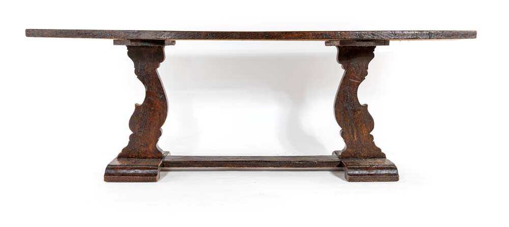 Lotto 3 | Tavolo fratino, XVII secolo, cm 82x234x66,5 piano rettangolare in abete poggiante su due...