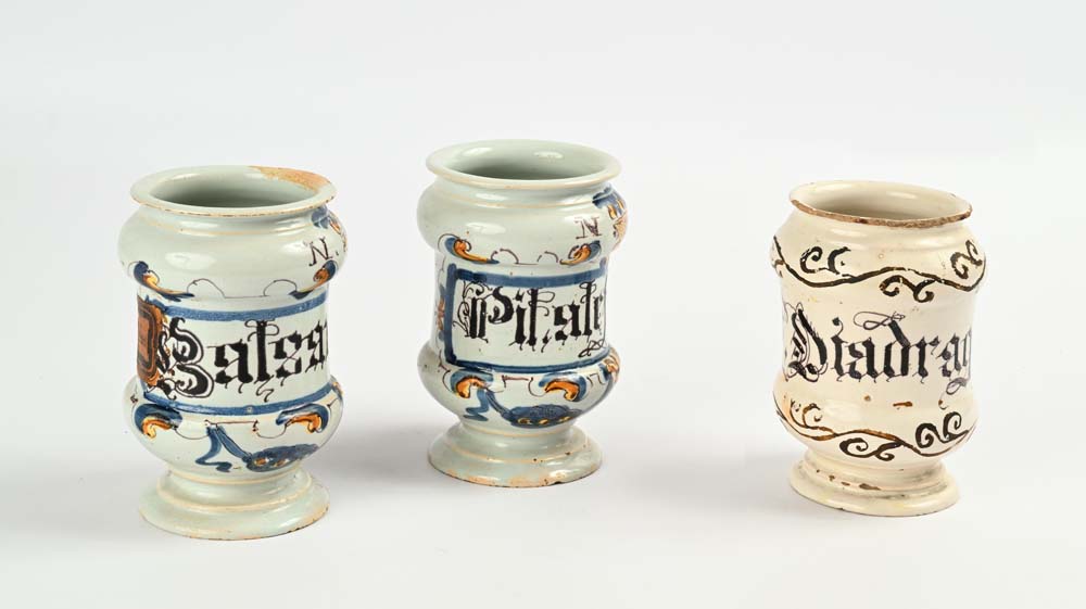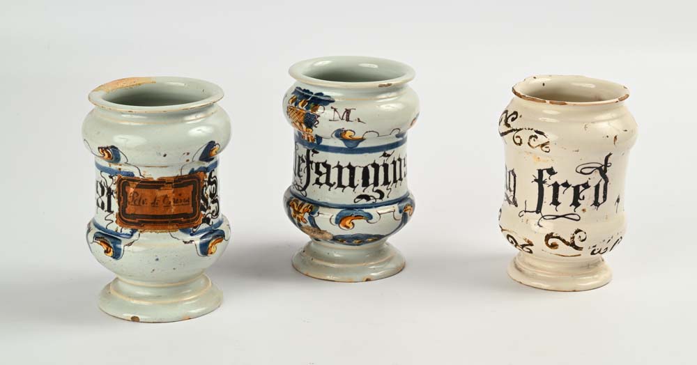 Tre albarelli diversi a decoro calligrafico, XVIII secolo altezza cm 14 coppia a rocchetto su piede circolare decorata nei toni del blu e del giallo con iscrizione in manganese; il terzo con strozzatura mediana cilindrica e decorazione in manganese. Difetti, rotture e mancanze