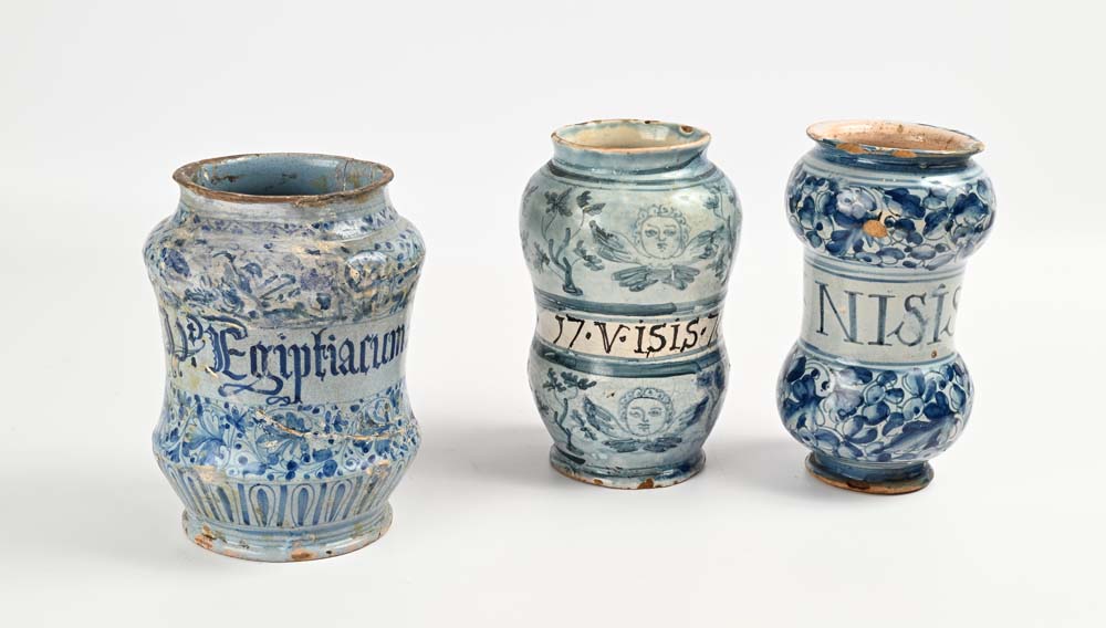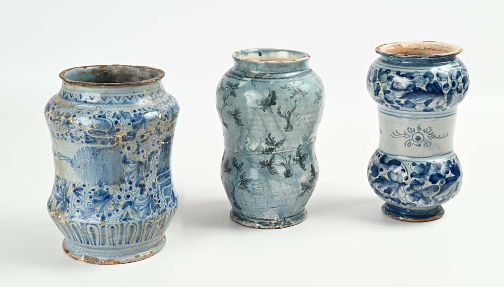 Lotto 7 | Tre albarelli in maiolica diversi, XVIII secolo altezza cm 20 e cm 21