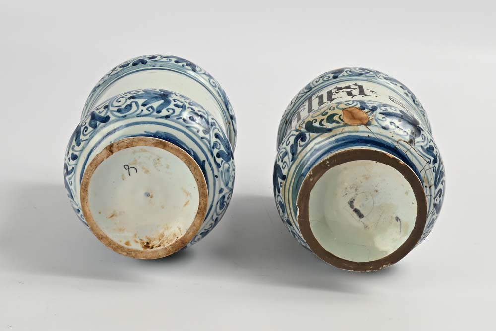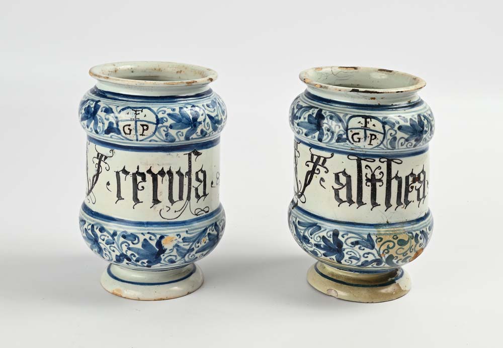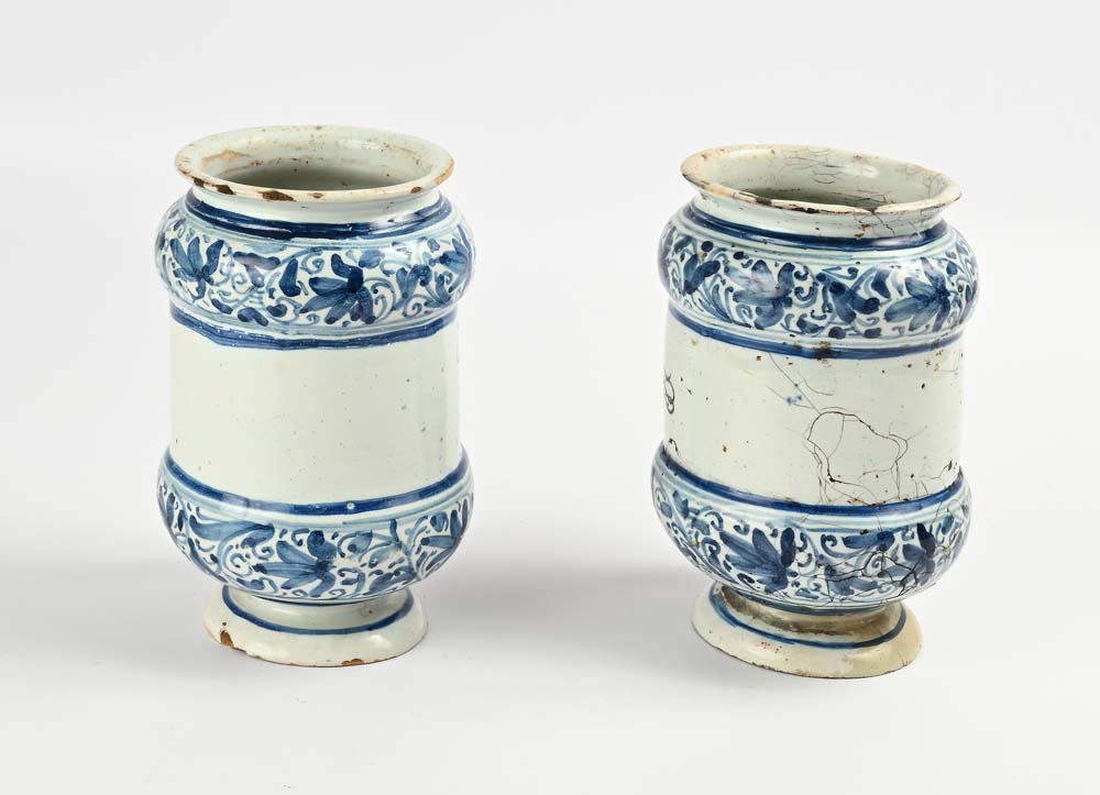 Coppia di albarelli a decoro calligrafico naturalistico, XVIII secolo altezza cm 19,5 corpo cilindrico su piede circolare e fascia mediana lievemente rientrante con iscrizione farmaceutica in manganese; lungo il profilo superiore riserva crociata con lettere FGP. Difetti di cottura e restauri