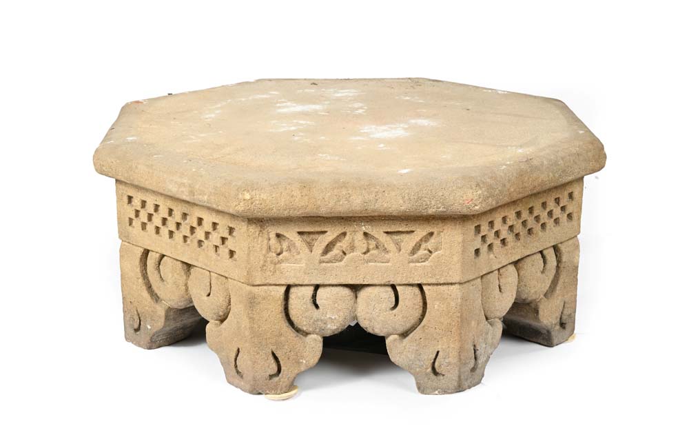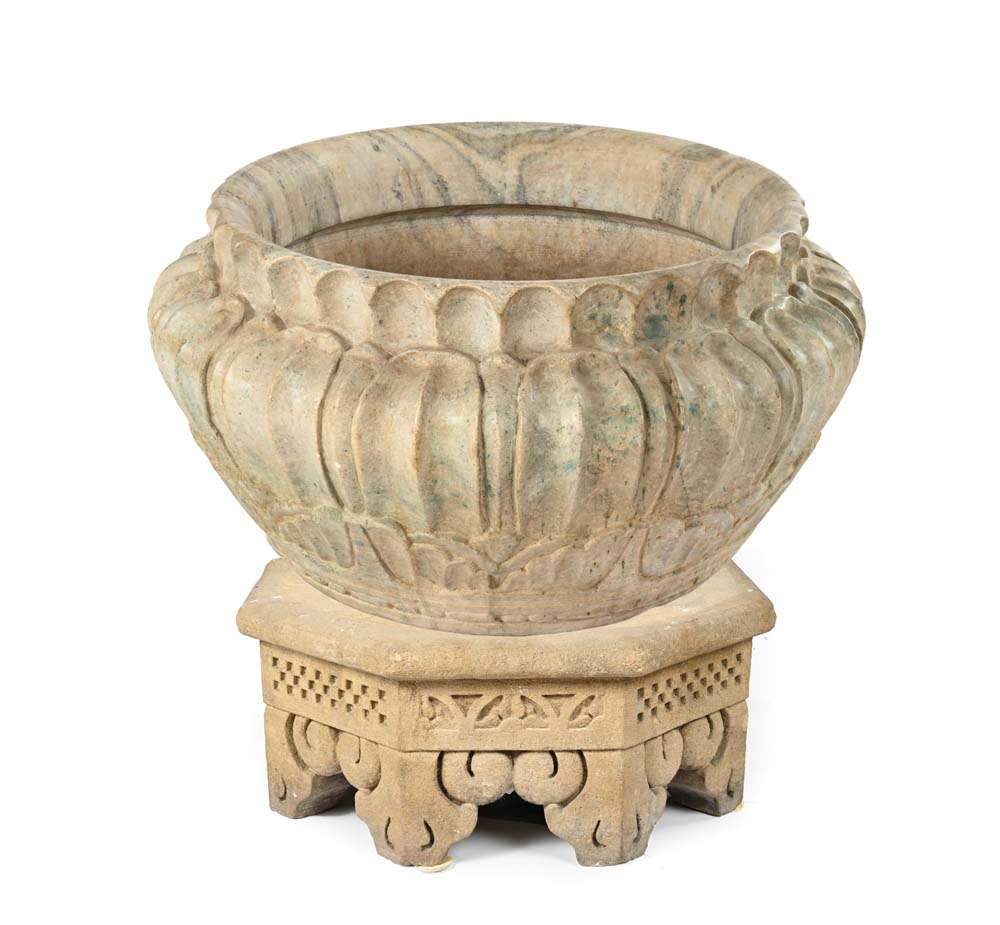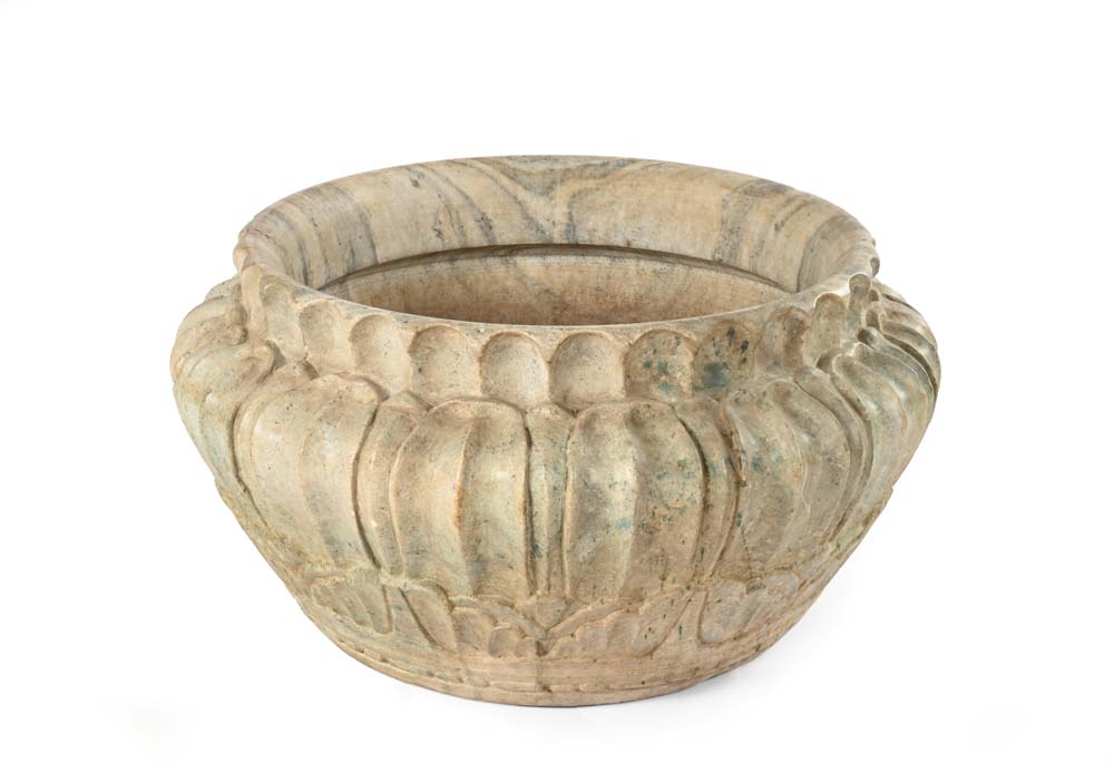 Grande vasca in marmo cipollino, XIX secolo cm 44x82 - la base altezza cm 24 di forma circolare scanalata con orlo svasato a simulare un fior di loto; base ottagonale in pietra