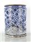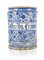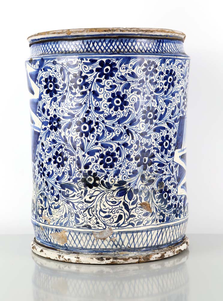 Grande albarello in maiolica bianca e blu, Liguria (?), XVII secolo cm 34x26 corpo cilindrico decorato da fitta composizione di motivi floreali; al centro iscrizione farmaceutica in caratteri gotici entro ampio cartiglio. Difetti e restauri