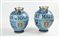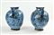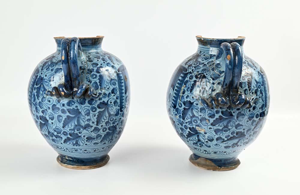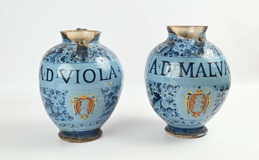 Coppia di orcioli in maiolica, XVII secolo altezza cm 33 con stemmi policromi ed iscrizioni farmaceutiche "Ad Malva" e "Ad Viola". Corpo sferico, beccuccio cilindrico, ansa sagomata; fitta decorazione vegetale in monocromia blu su fondo berettino. Rotture e mancanze