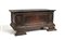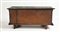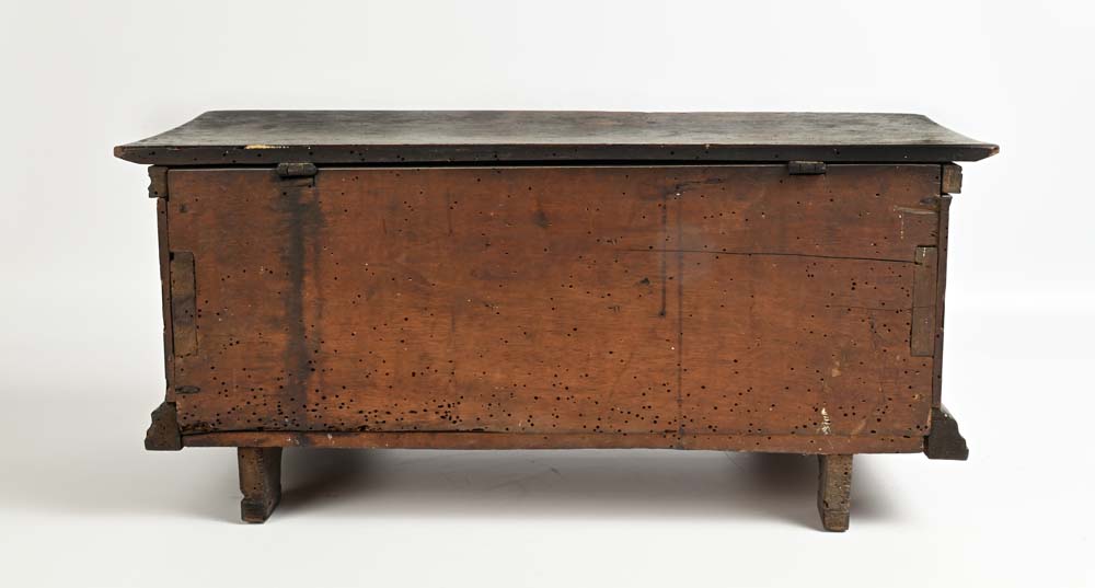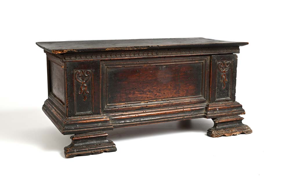 Cassetta in noce, XVII secolo cm 28x62x28 coperchio con serramenti in ferro, sottolineato da dentelli; facciata con specchiatura centrale delimitata da formelle con cascatelle intagliate in rilievo; piedi a mensola modanata. Difetti e restauri