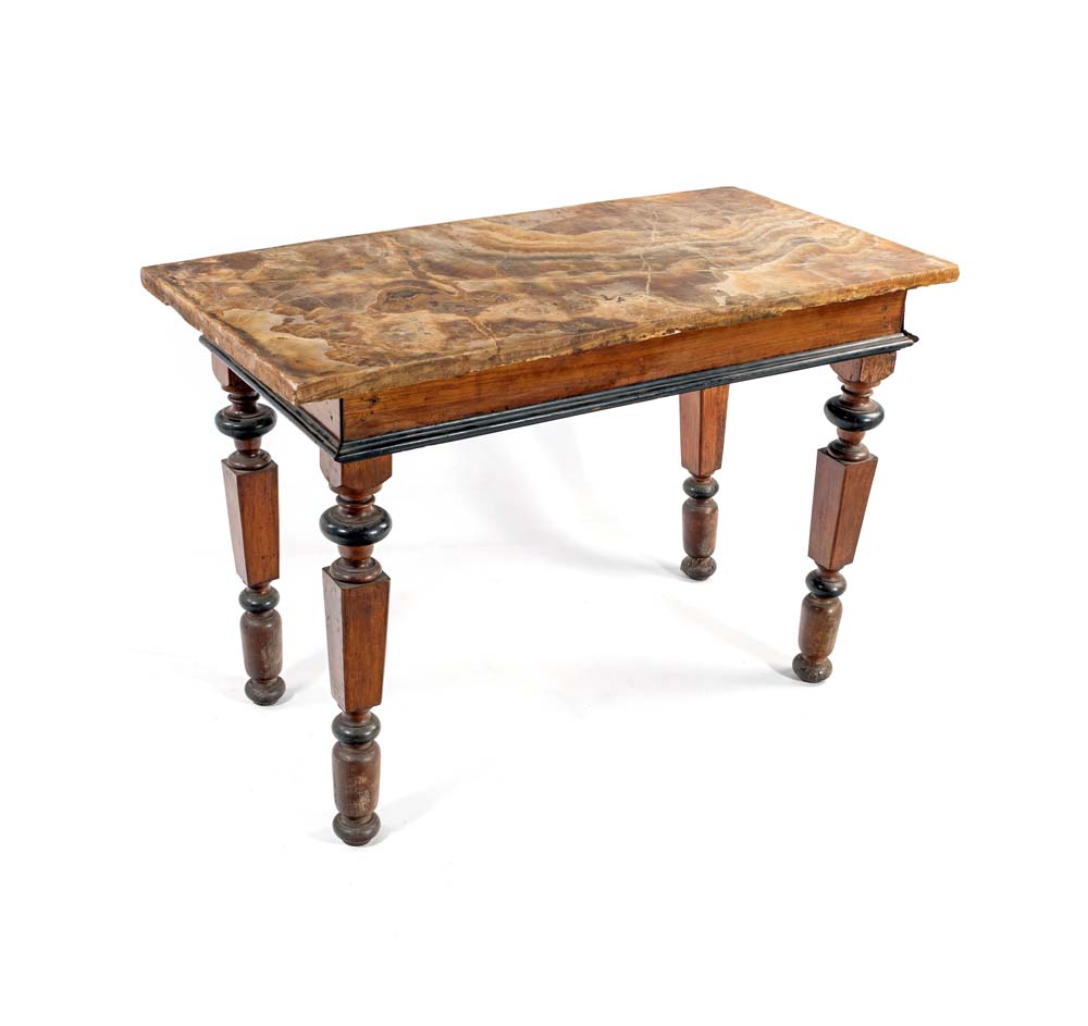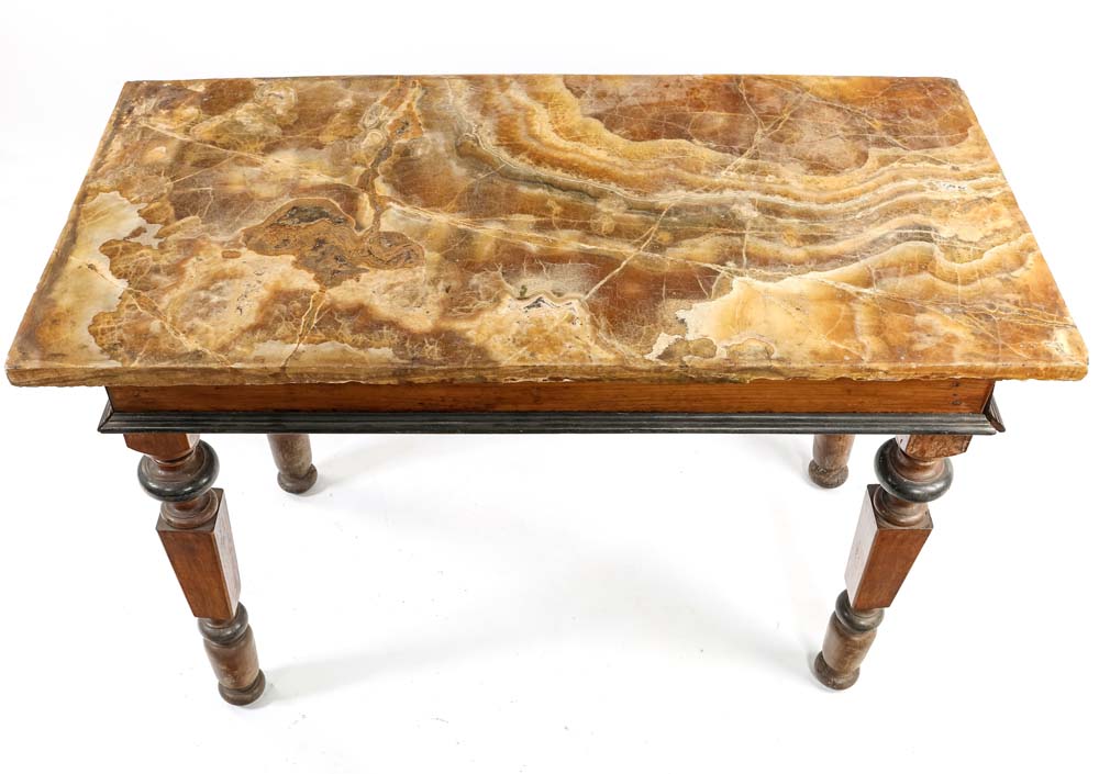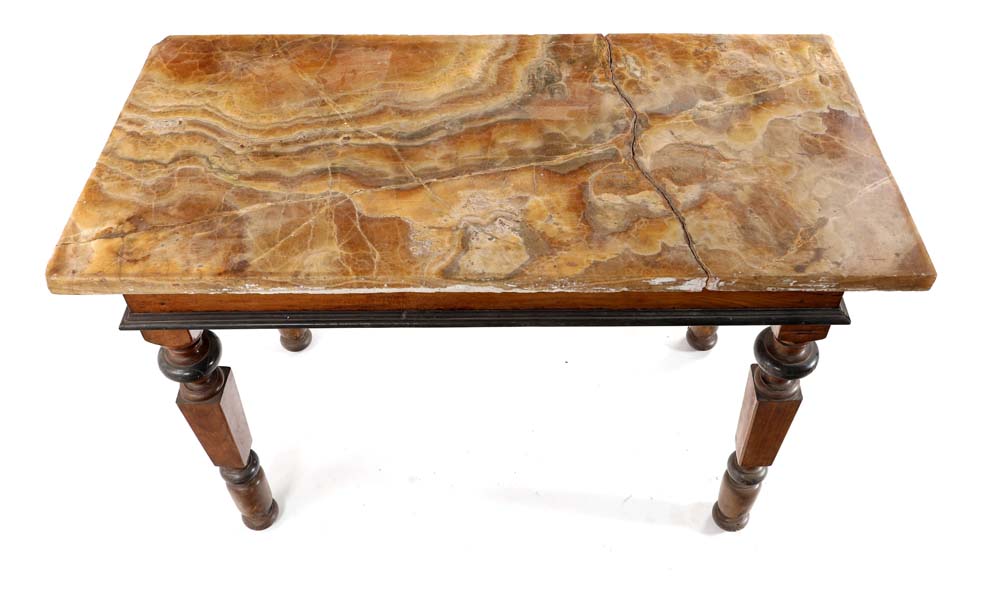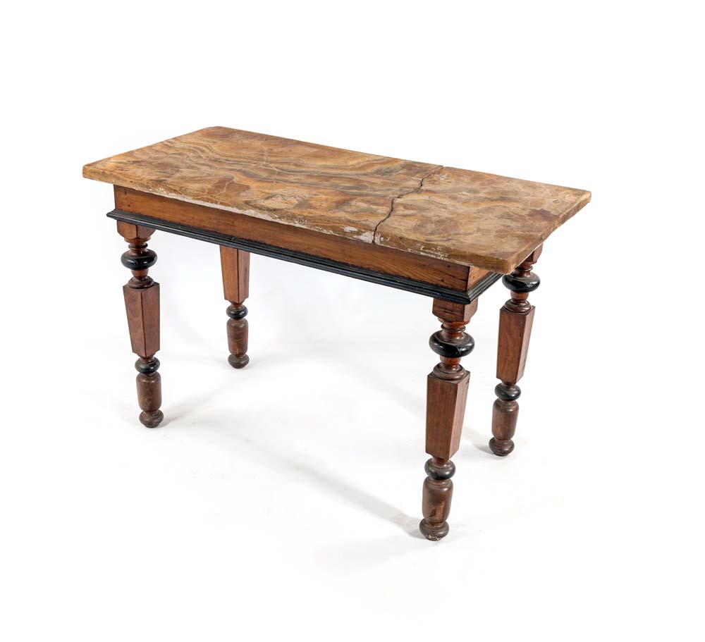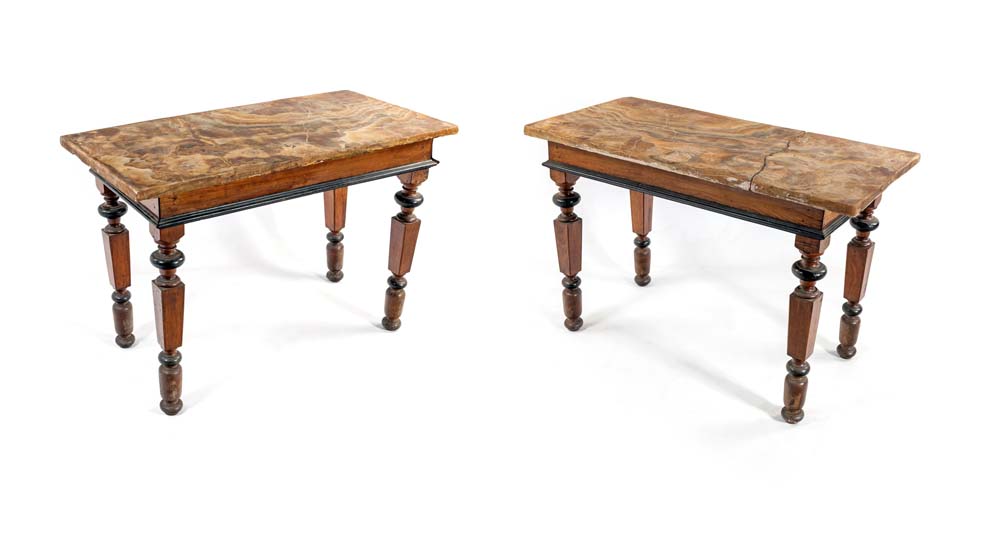 Coppia di piani in alabastro montati su tavoli da muro, XVII/XIX secolo cm 82x121x60 gambe composite con parti squadrate intervallate da elementi torniti ed ebanizzati Collezione privata, Siena.