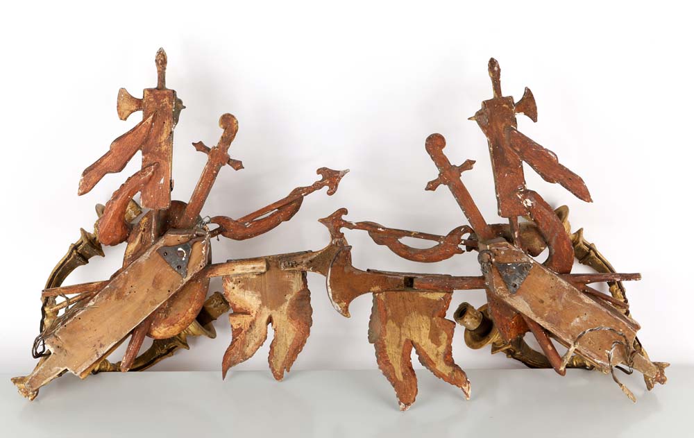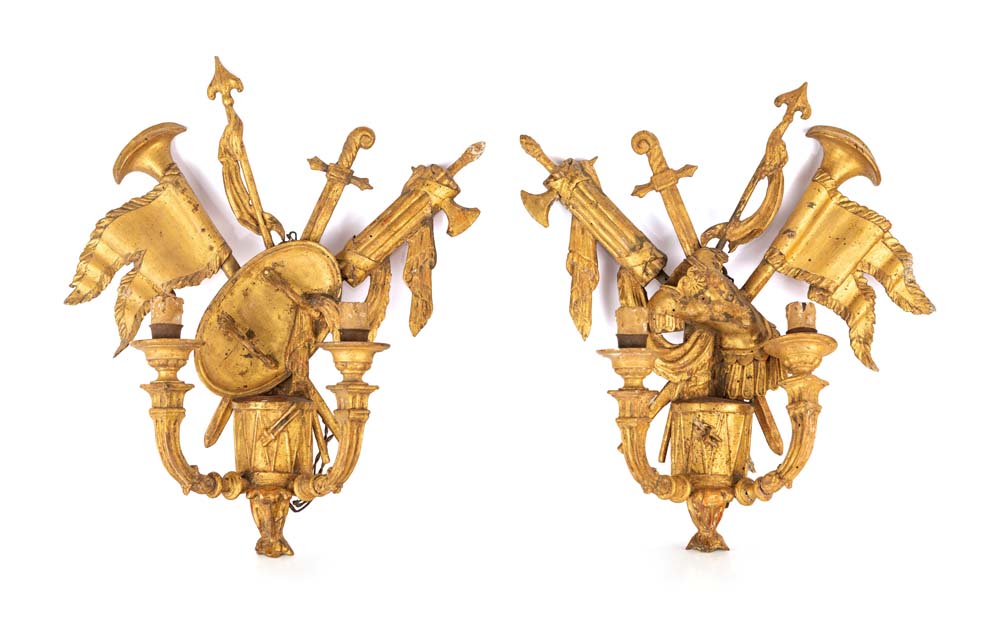 Coppia di appliques a due luci in legno intagliato e dorato in forma di trofeo, XVIII secolo cm 47x38x15 costruite per essere disposte vis à vis con panoplie e vessilli svolazzanti