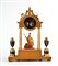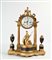 Orologio a portico in legno dorato, XIX secolo cm 60x47x20 struttura architettonica caratterizzata da figura di Minerva e ai lati vasi ad urna; quadrante circolare a tre fori di carica con fascia oraria a numeri romani, minuti e datario a cifre arabe