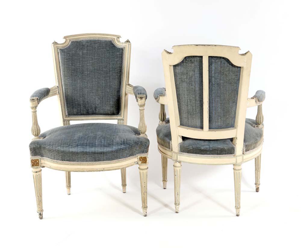 Coppia di poltroncine Luigi XVI in legno laccato bianco e oro, XIX secolo cm 89x58x53 schienale e sedile imbottiti rivestiti in velluto azzurro, braccioli lineari sorretta da montanti a balaustro, gambe rastremate scanalate