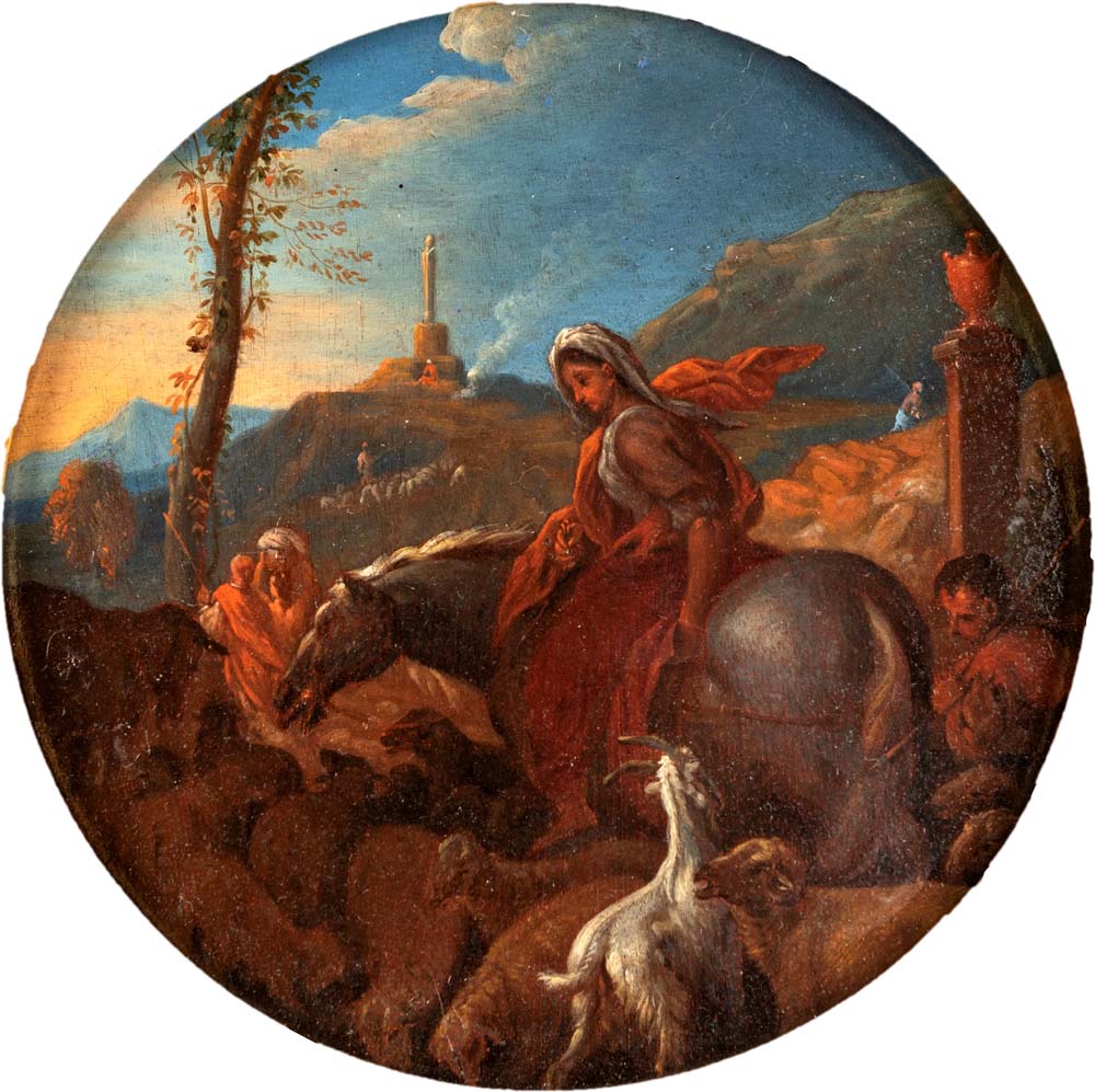 Pittore romano del XVIII secolo Flora in viaggio tra Pastori olio su tavola diametro cm 21 - con cornice diametro cm 27