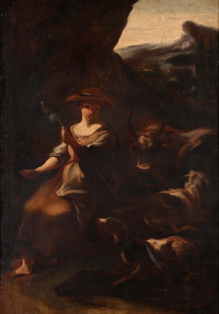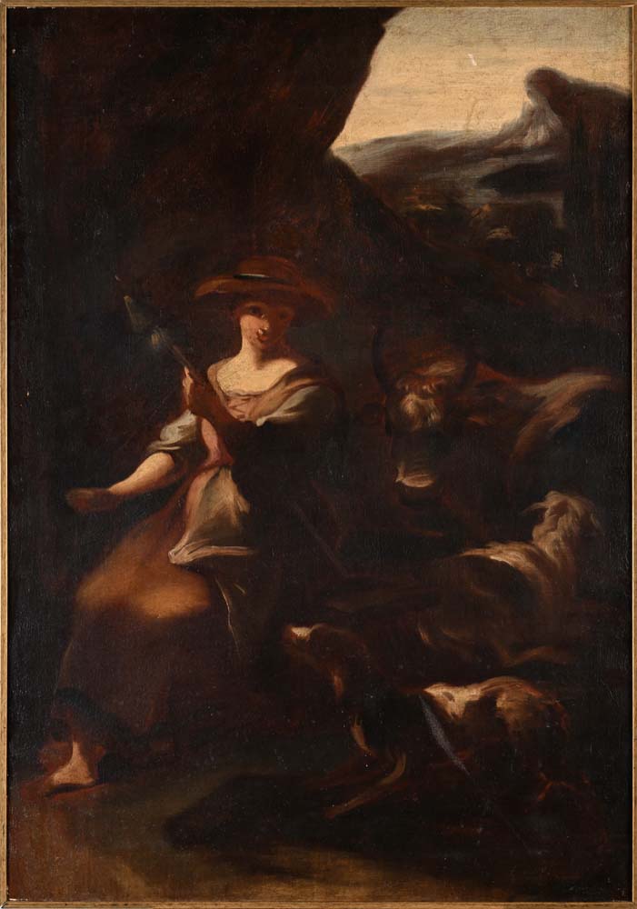 Anonimo del XVII secolo Contadina che fila, con armenti Olio su tela cm 103,5 x 72,5