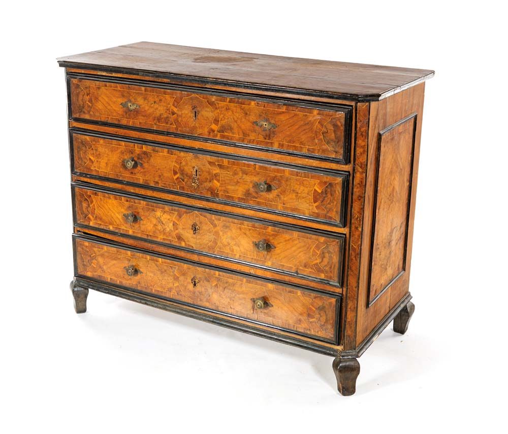 Canterano in noce a quattro cassetti, Lombardia, XVII secolo cm 106x132x63 sottili filettature sono poste a cornice delle varie partizioni; piedi a mensola. Difetti
