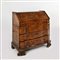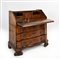 Cassettone a ribalta in noce con specchi in radica, Emilia/Ferrara, XVIII secolo cm 105x100x54 - ribalta aperta cm 83 all'interno porzione centrale del piano scorrevole con ampio vano interno suddiviso in scomparti ed un'antina mediana concava affiancata da un vano con tiretto sottostante; facciata sagomata a balestra con tre cassetti, piedi a mensola intagliata
