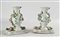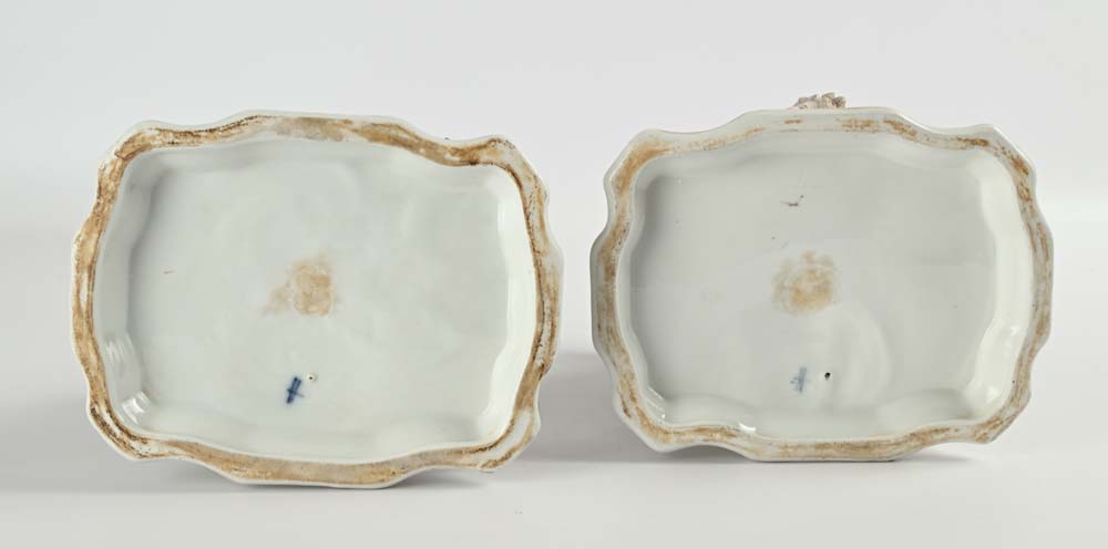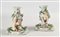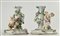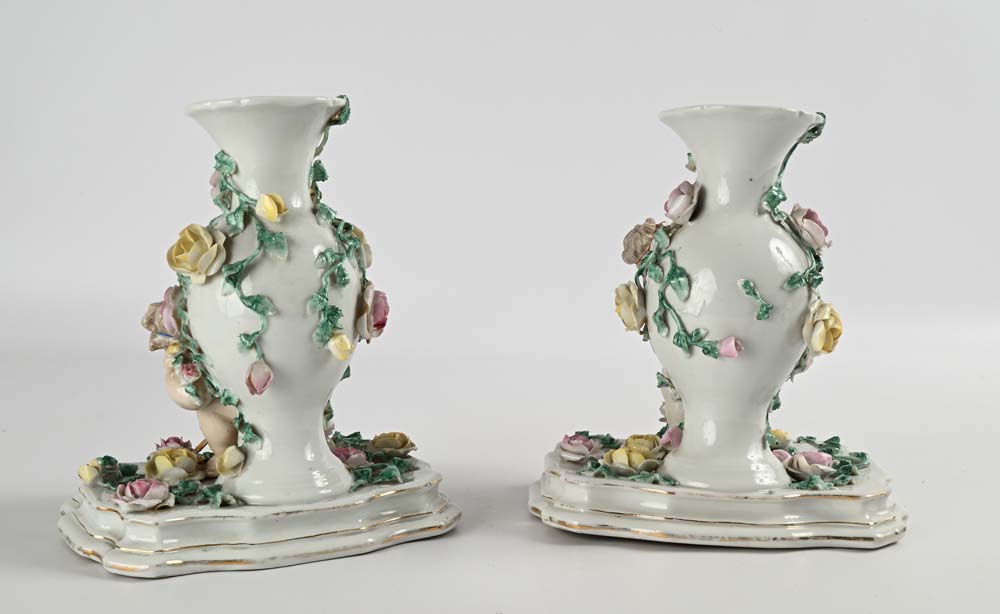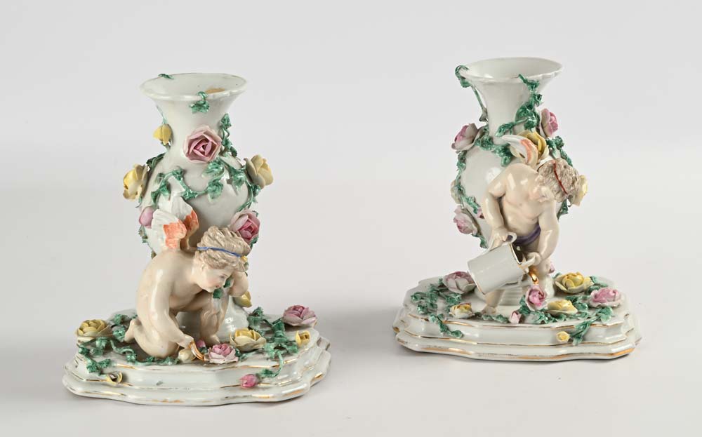 Coppia di vasi in porcellana policroma, Germania, XIX secolo cm 21,5x20x15 con figure di amorino giardiniere e composizioni di fiori in rilievo su base rettangolare sagomata